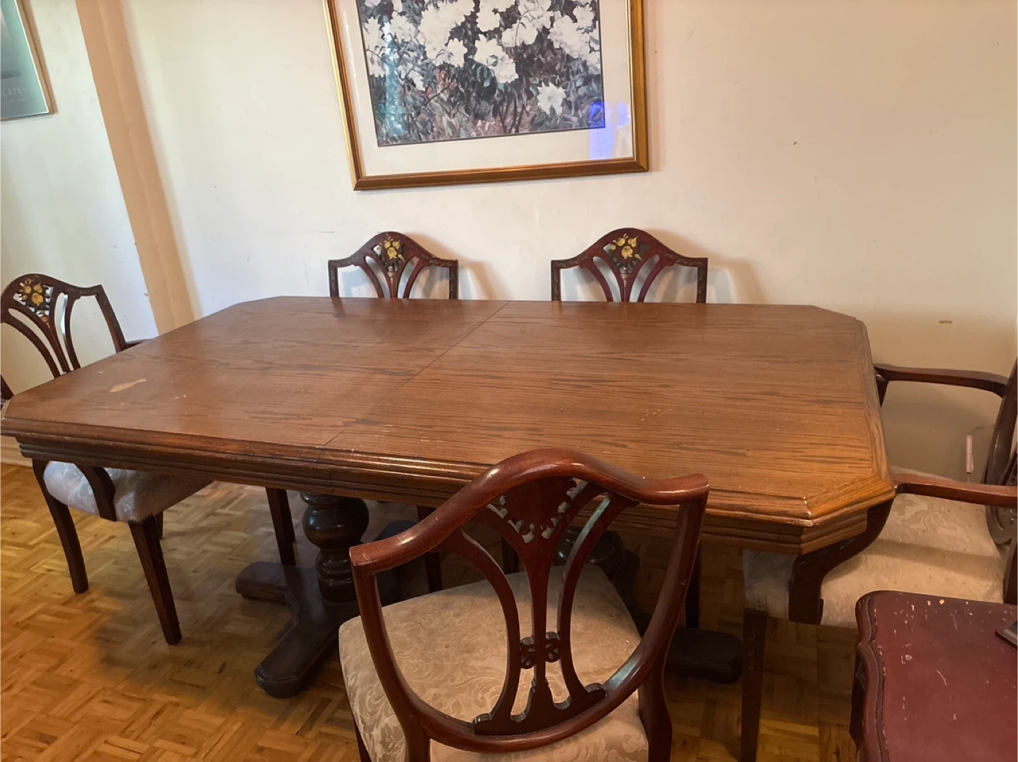 Selling a dining table with six chairs. The table is made of wood and has a pedestal base. The chairs have upholstered seats and backs. There are some signs of wear and tear.