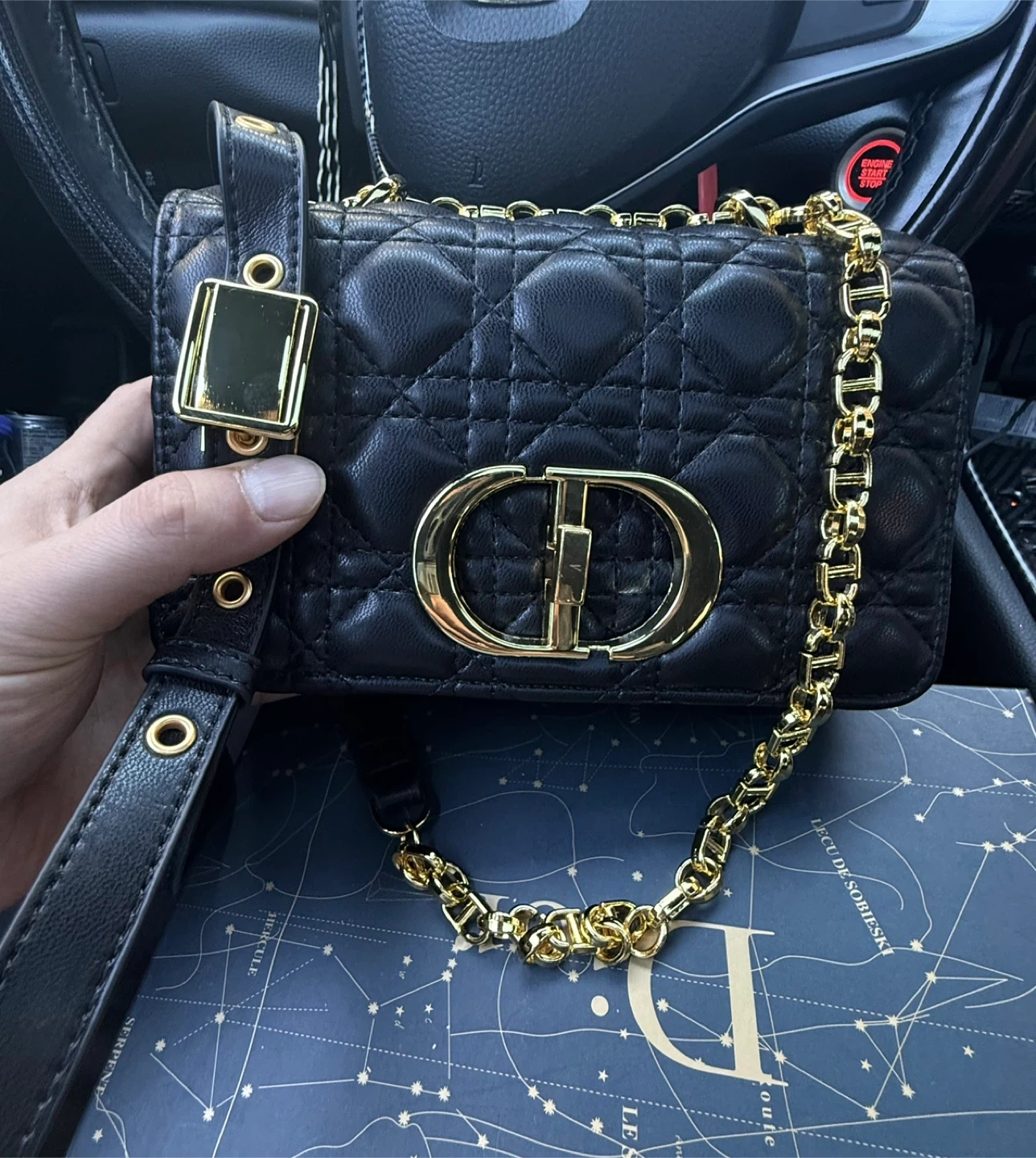 Selling a stylish Dior black quilted leather bag with a gold chain strap. It features the iconic Dior logo. This bag is perfect for adding a touch of elegance to any outfit!