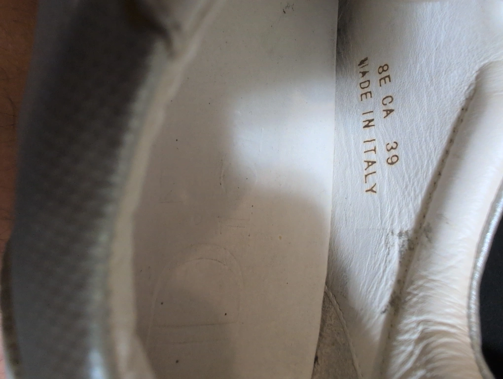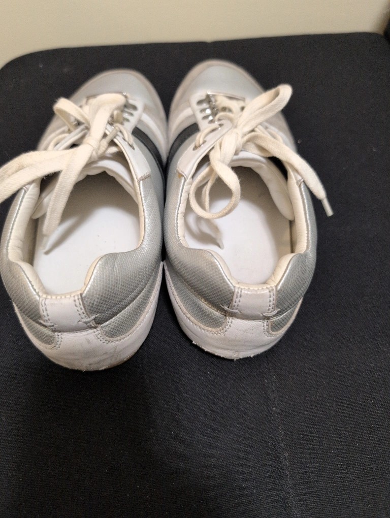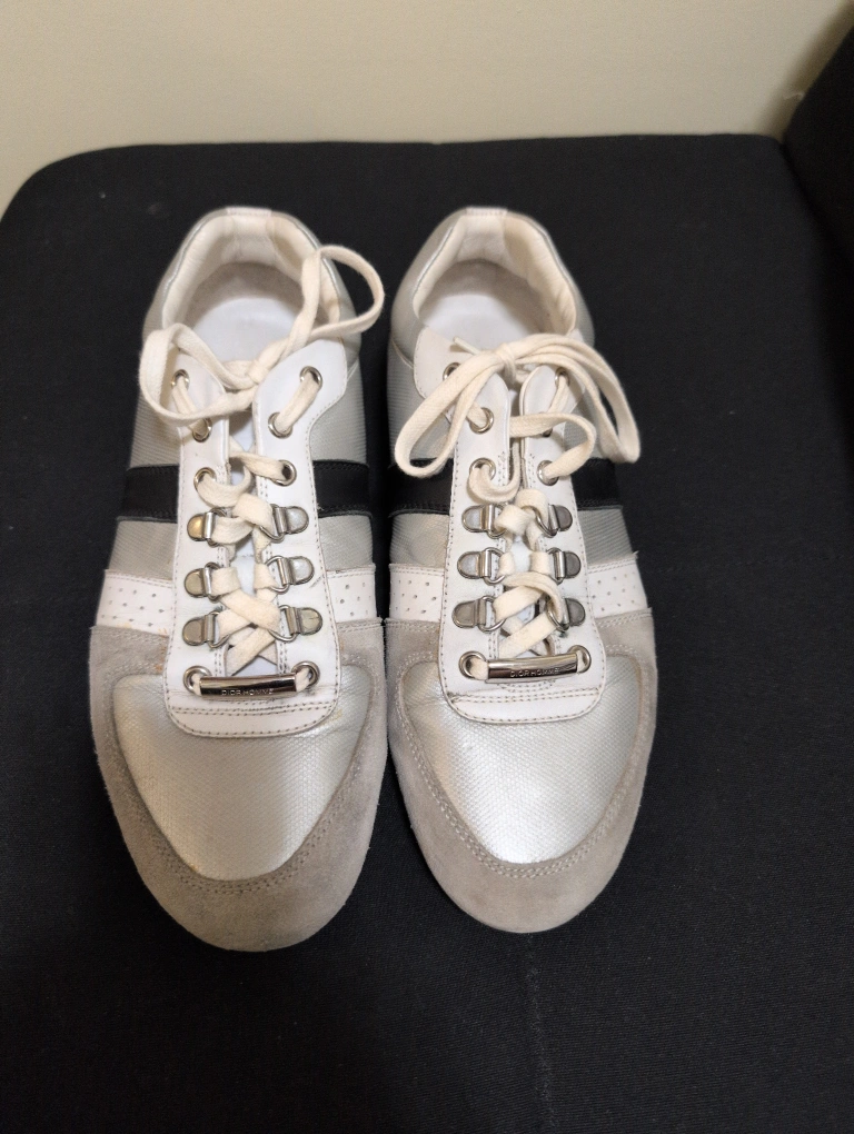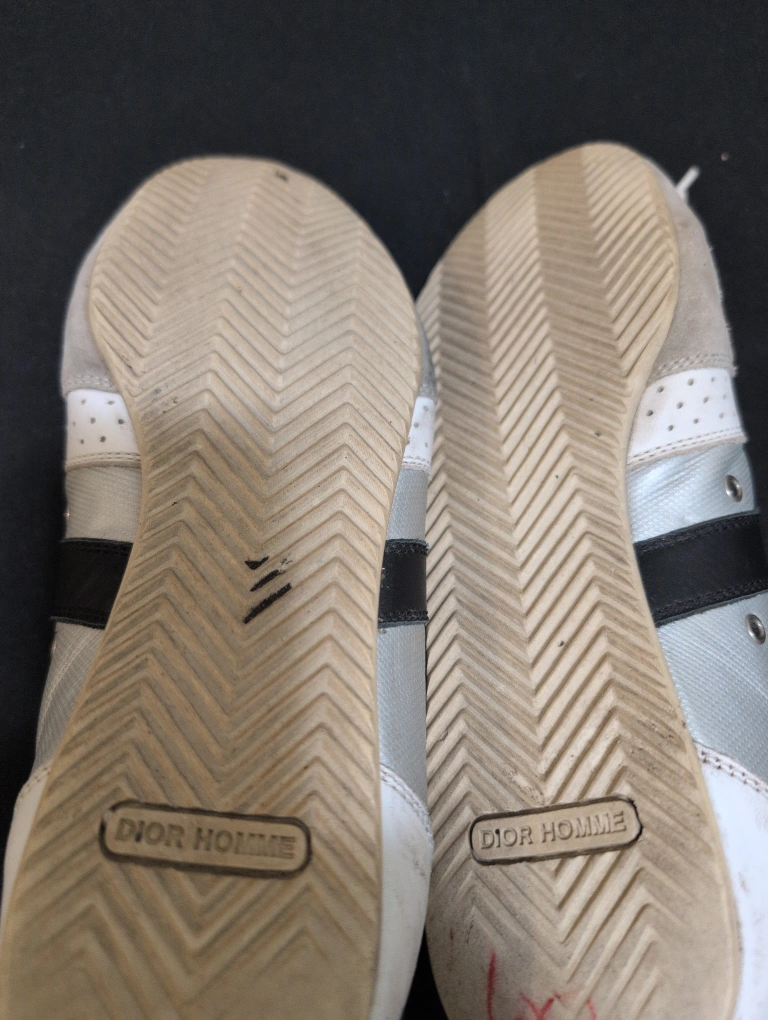 Selling a pair of Dior Homme sneakers. They are a size 39, which is approximately a US size 8. They show some signs of wear, particularly on the soles, but are still in good condition for casual wear. The sneakers feature a stylish white, silver, and black design with lace-up closure. Perfect for adding a touch of luxury to your everyday look