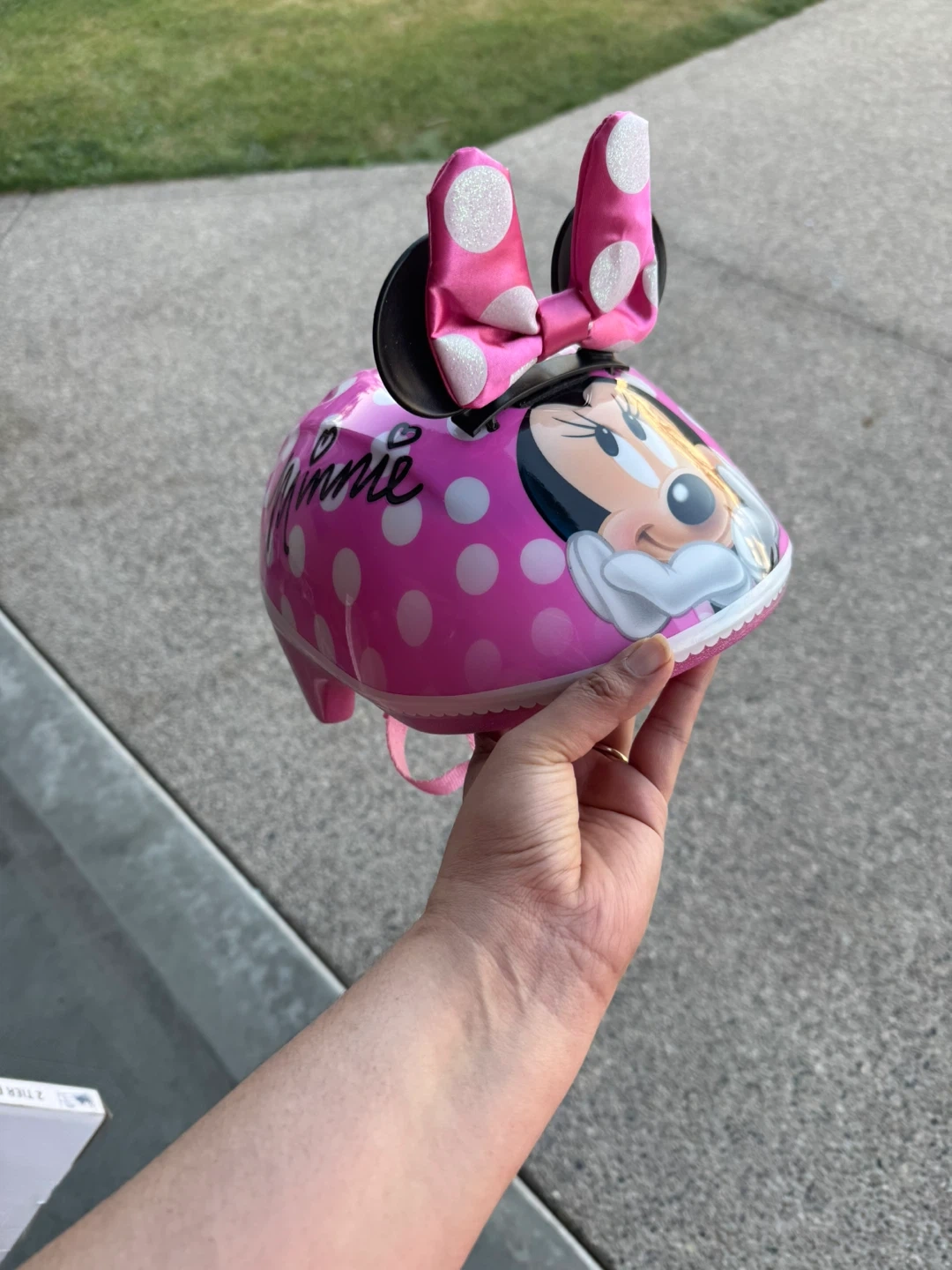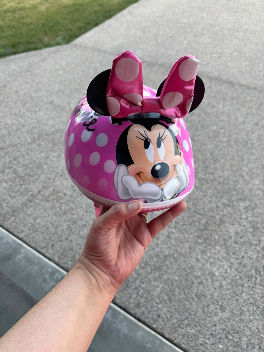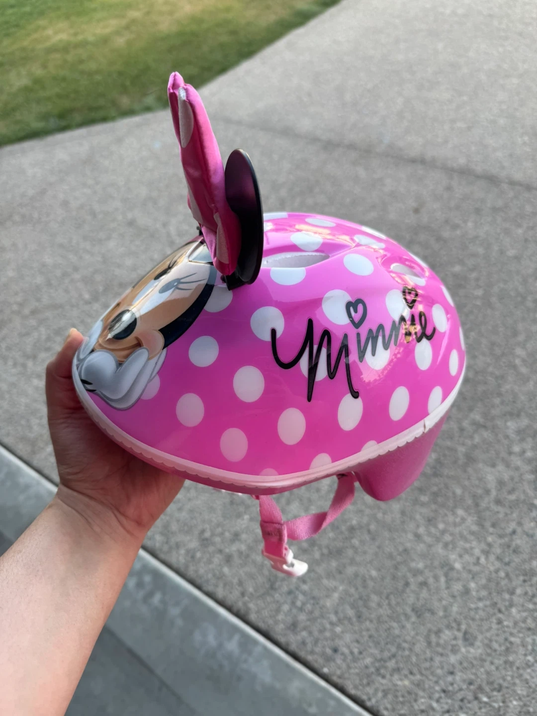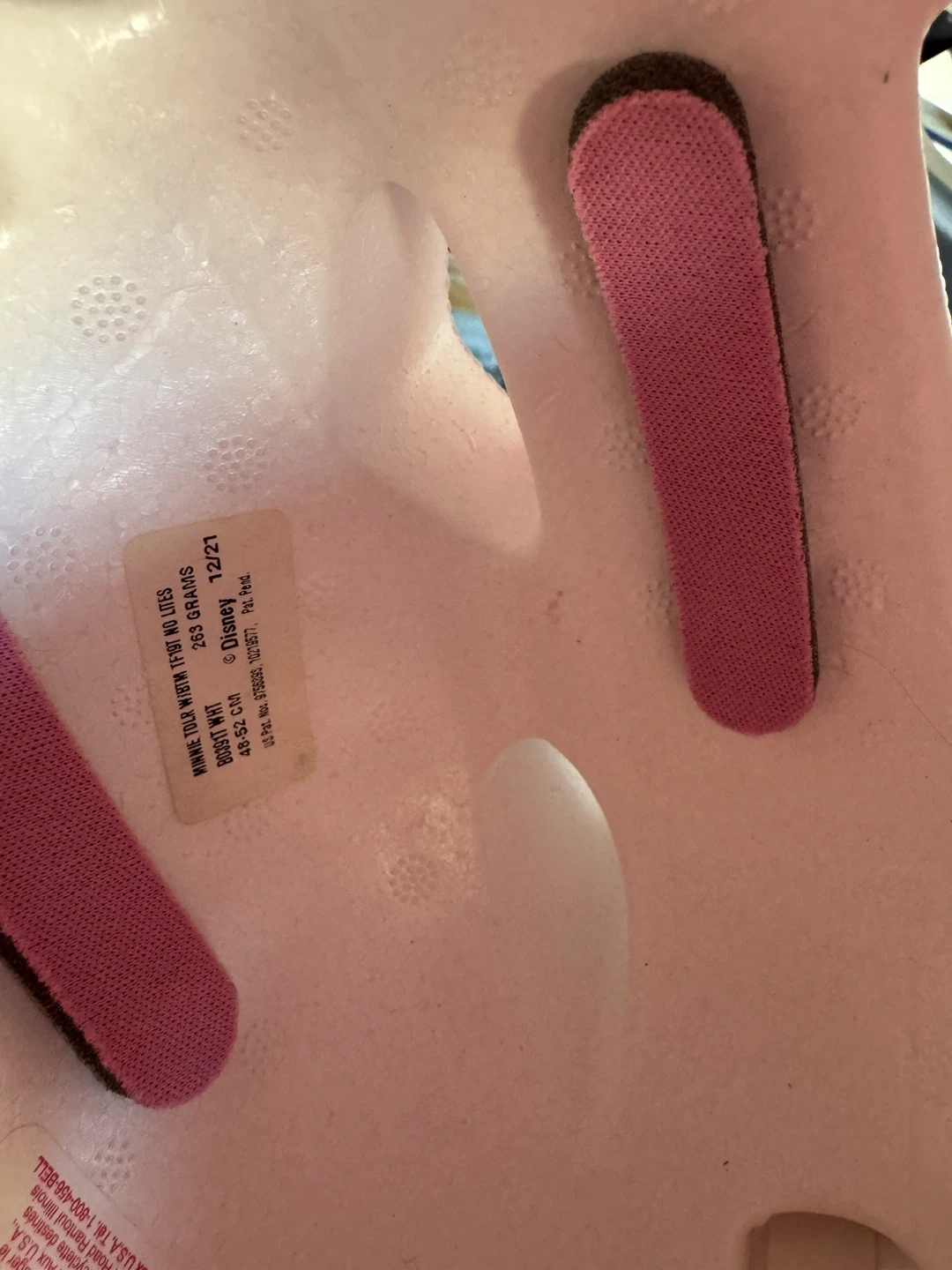 Selling a cute Disney Minnie Mouse toddler helmet! It's in great condition. The helmet is pink with white polka dots and has Minnie Mouse on the front. It's size 48-52 cm and weighs 265 grams. The manufacturing date is December 2021