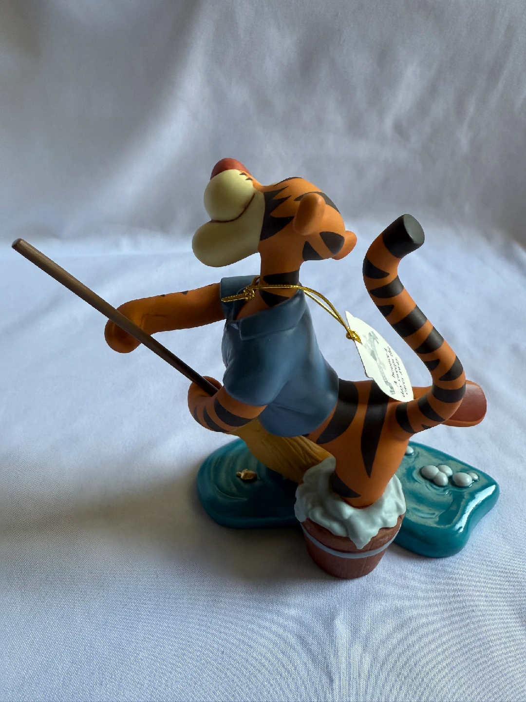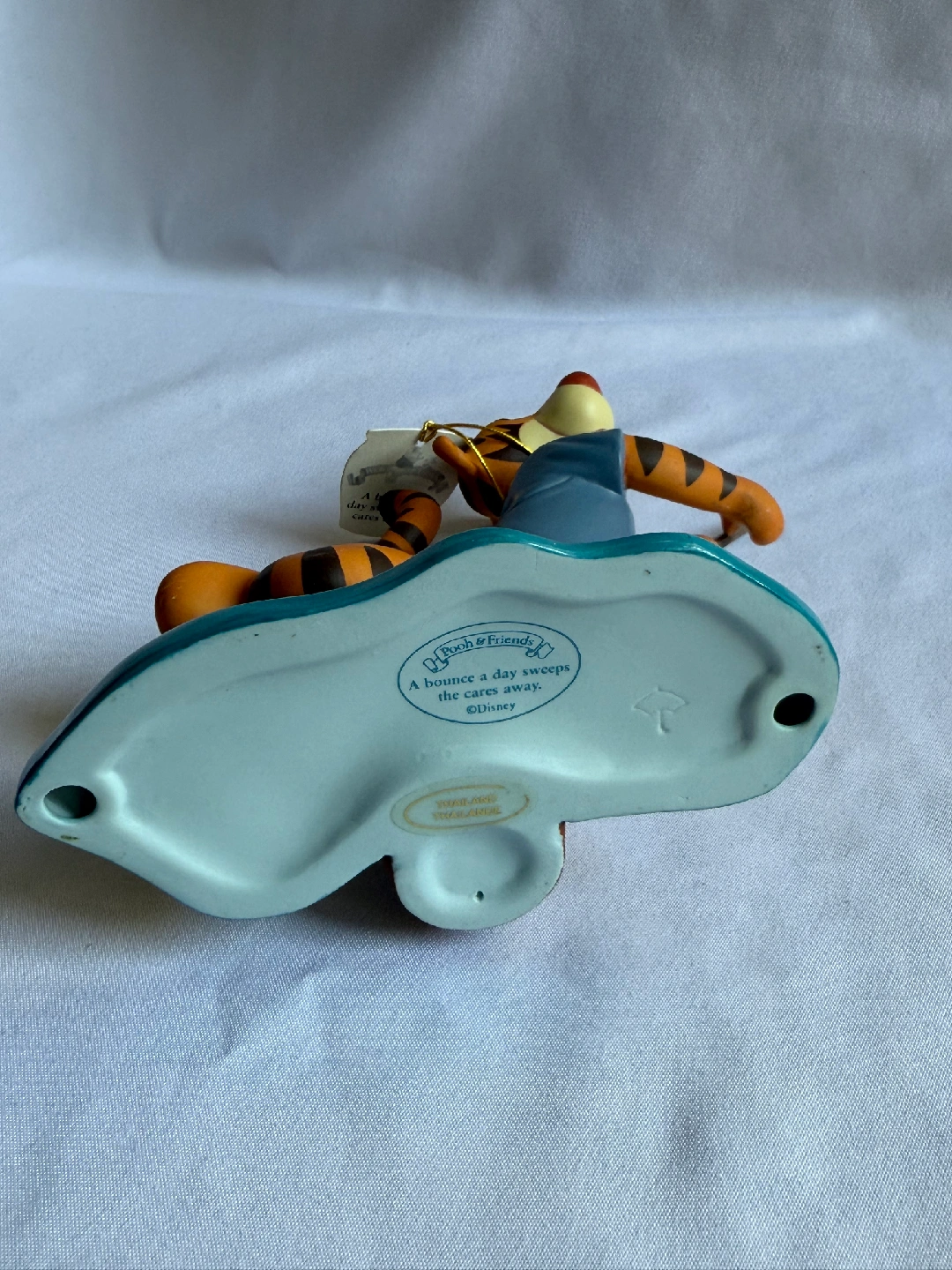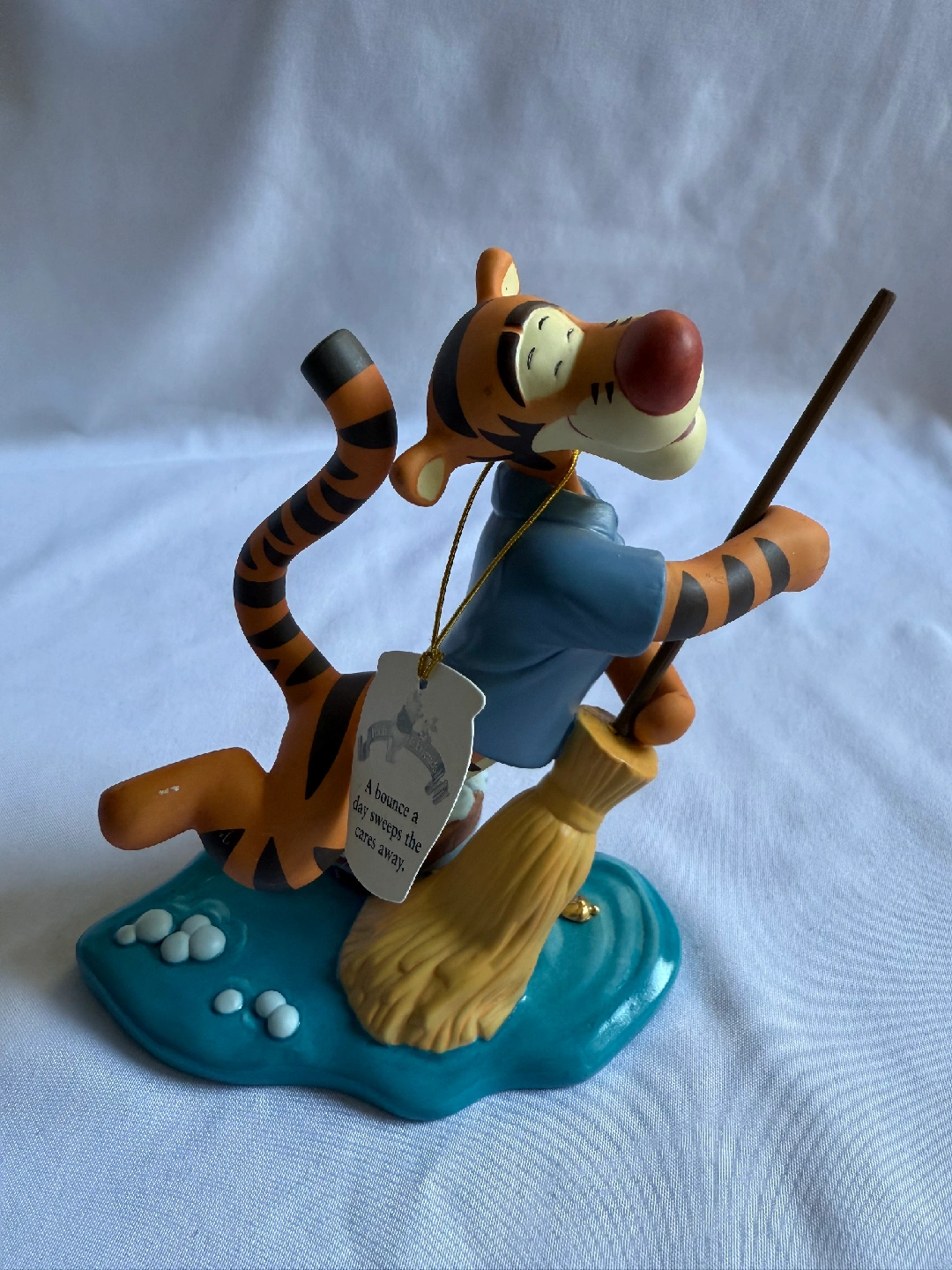 This is a cute Tigger figurine from Disney's Winnie the Pooh collection. It features Tigger bouncing on his tail with a broom. 'A bounce a day sweeps the cares away'. It's in great condition and would make a lovely addition to any Disney collection