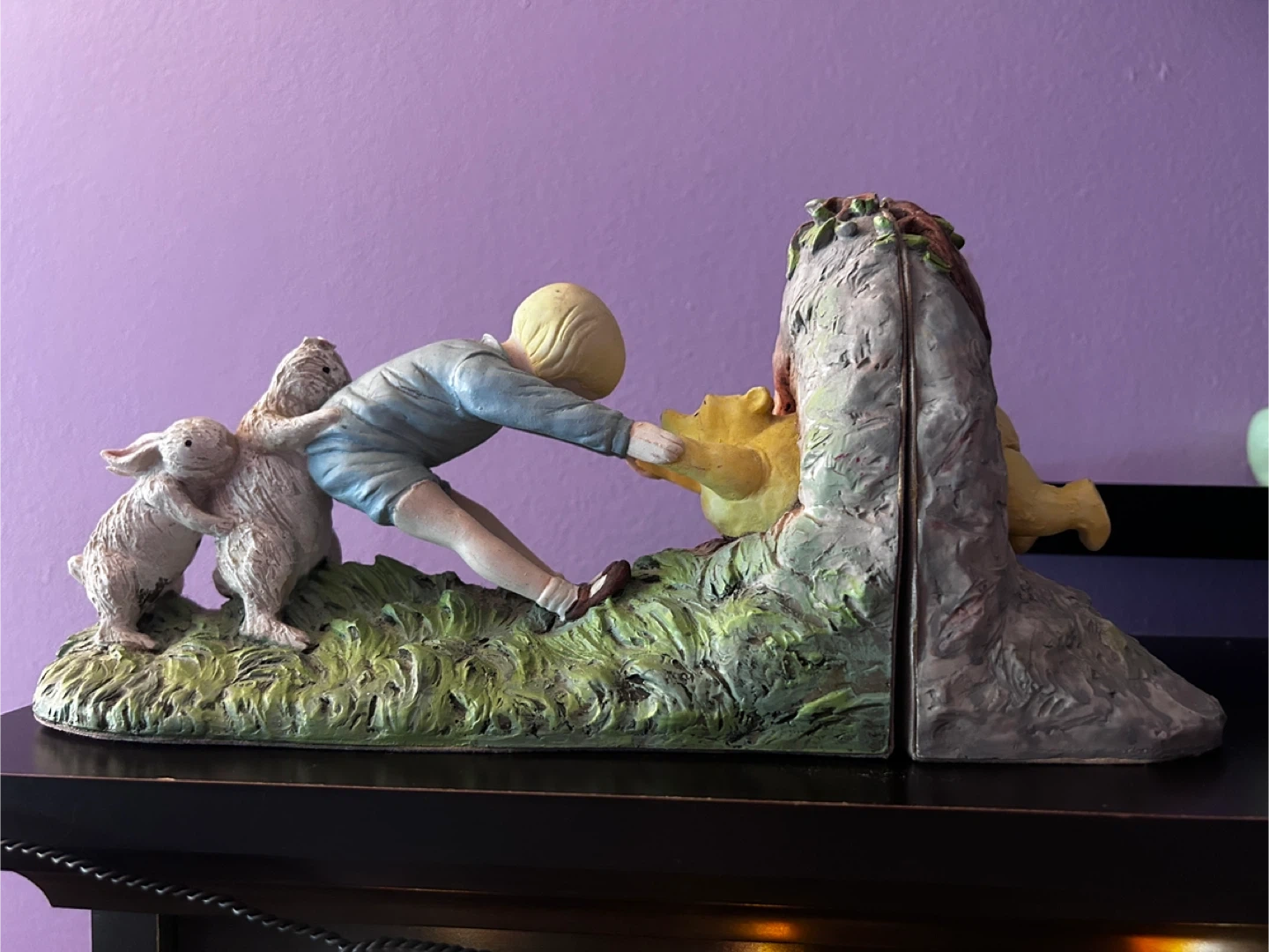 Selling a pair of Disney Winnie the Pooh bookends! They feature Christopher Robin and the rabbits helping Pooh get out of the rabbit hole. One bunny missing ear. They're perfect for any Disney lover!
