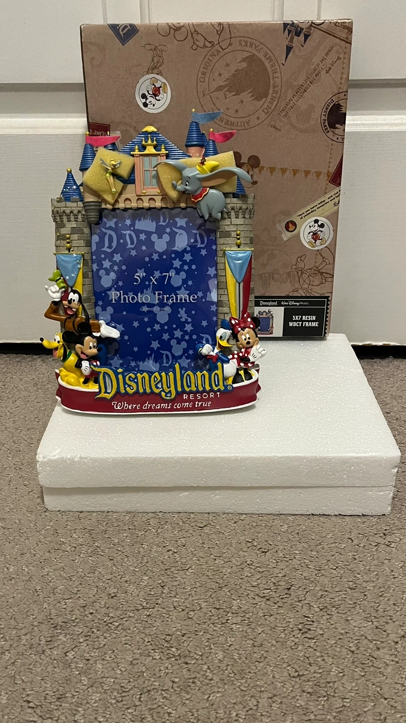 I'm selling a Disneyland Resort photo frame that holds a 5x7 inch picture! It features Mickey, Minnie, Donald, Goofy, and Pluto, plus Dumbo and Tinkerbell on the castle. The box is included!