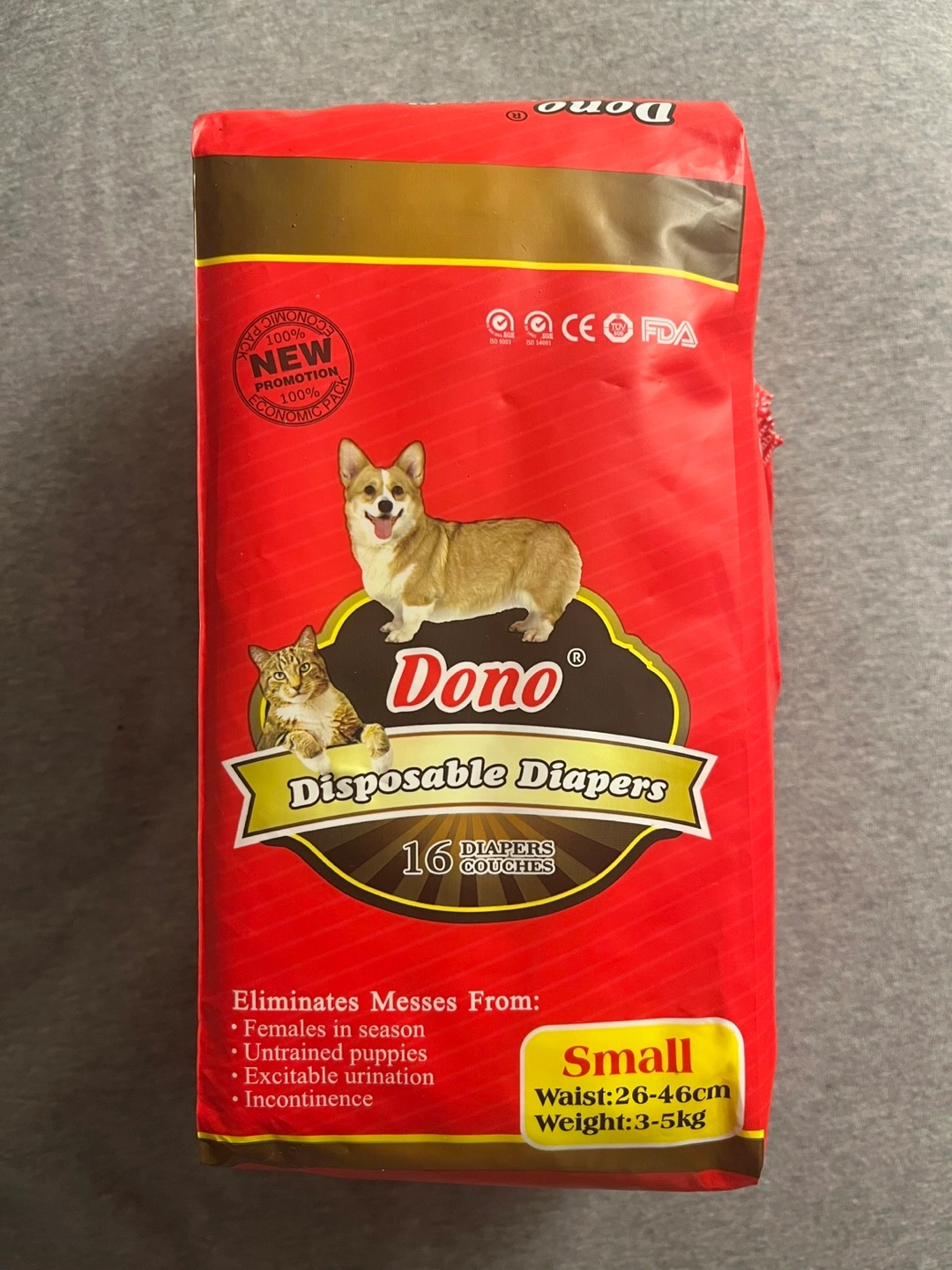 Selling a pack of Dono disposable diapers for dogs. These are size small, suitable for dogs with a waist size of 26-46cm and weighing 3-5kg. They're designed to help with messes from females in season, untrained puppies, excitable urination, and incontinence New, but I opened the package and learned that it was too small for my dog. Pick up: Steveston North