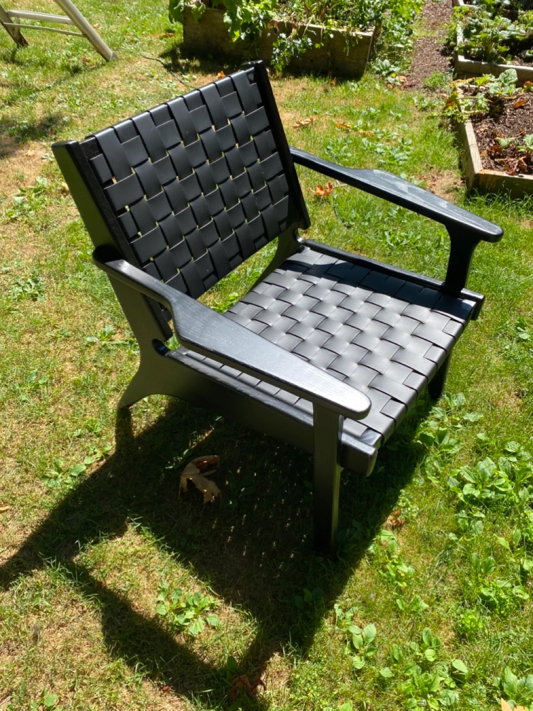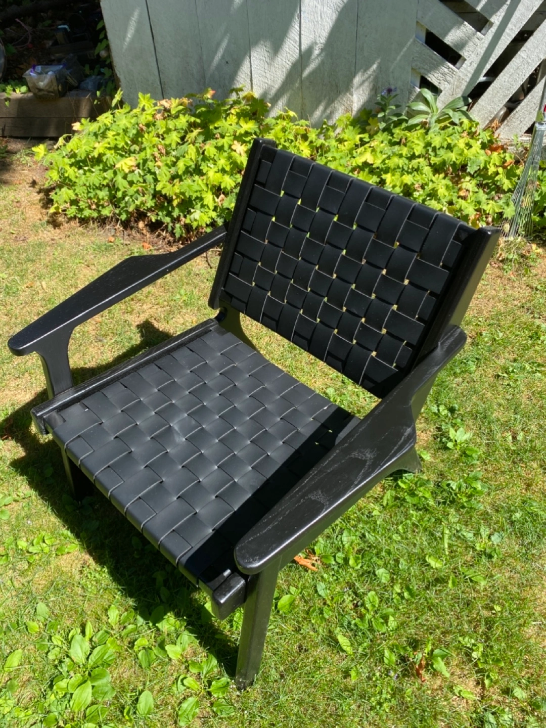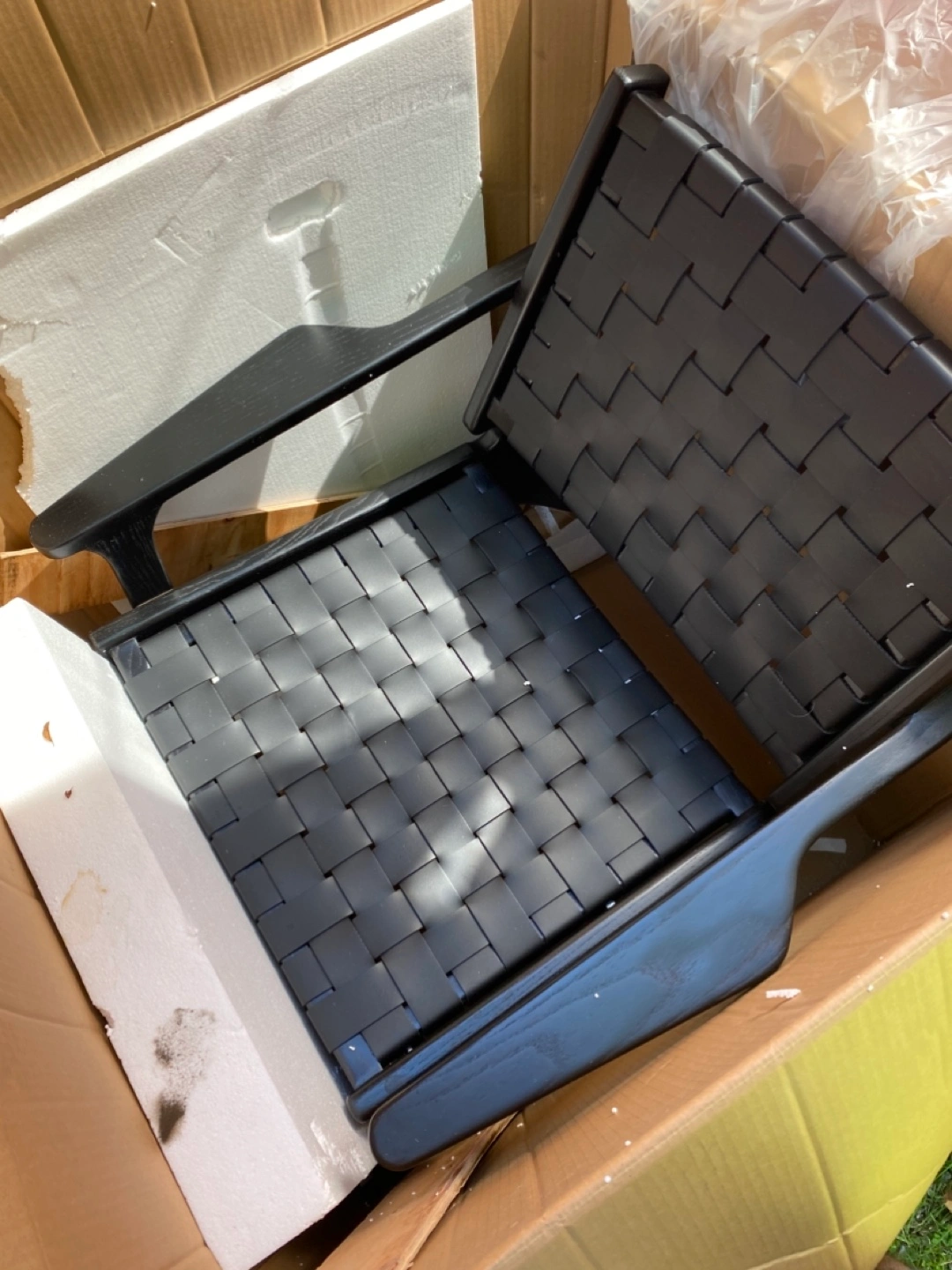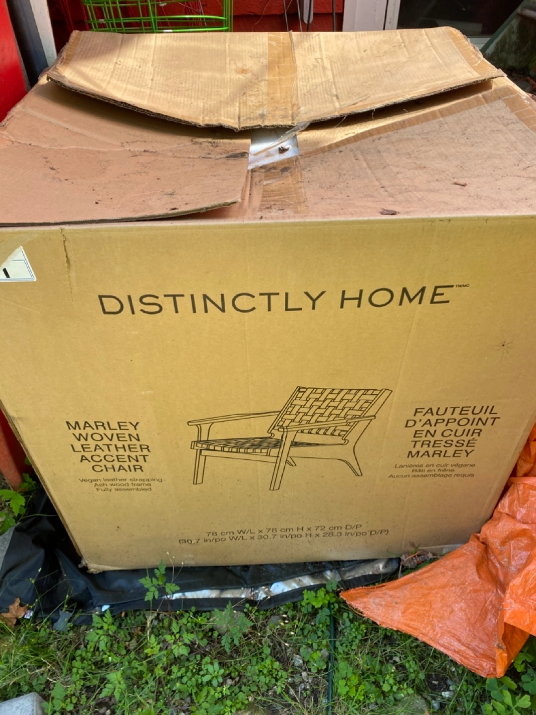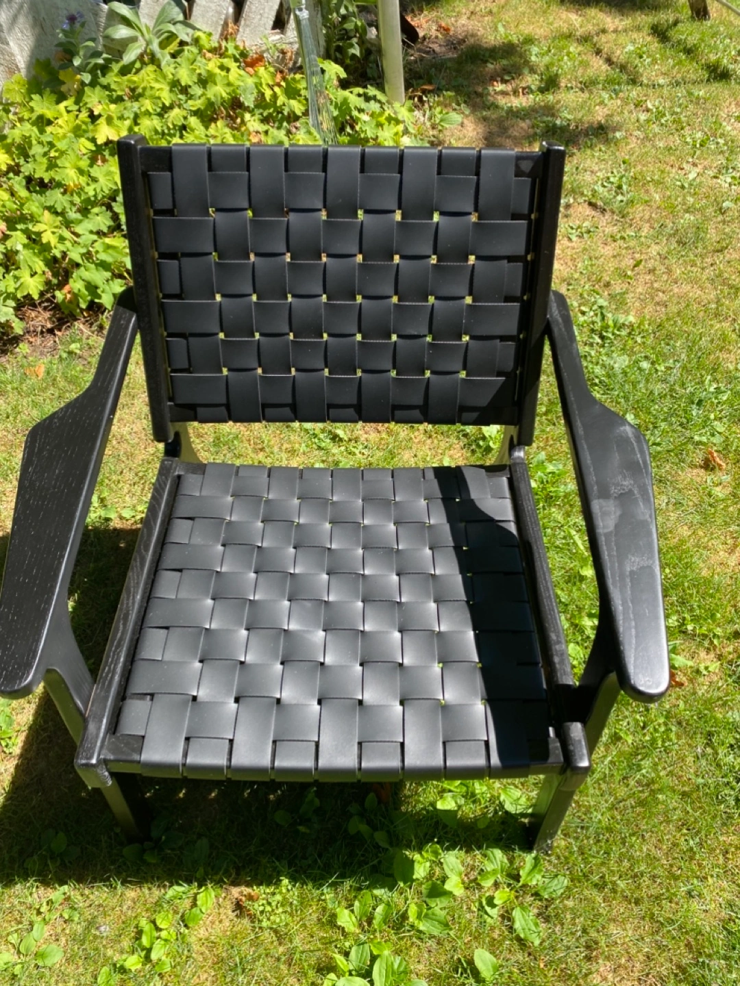 Selling a Distinctly Home Marley Woven Leather Accent Chair in black. BNIB The chair features vegan leather strapping and an ash wood frame. Dimensions are 78 cm W/L x 78 cm H x 72 cm D (30.7 in/po W/L x 30.7 in/po H x 28.3 in/po D/P)