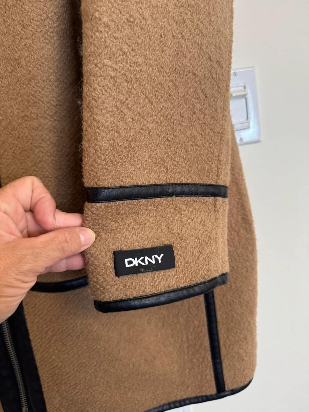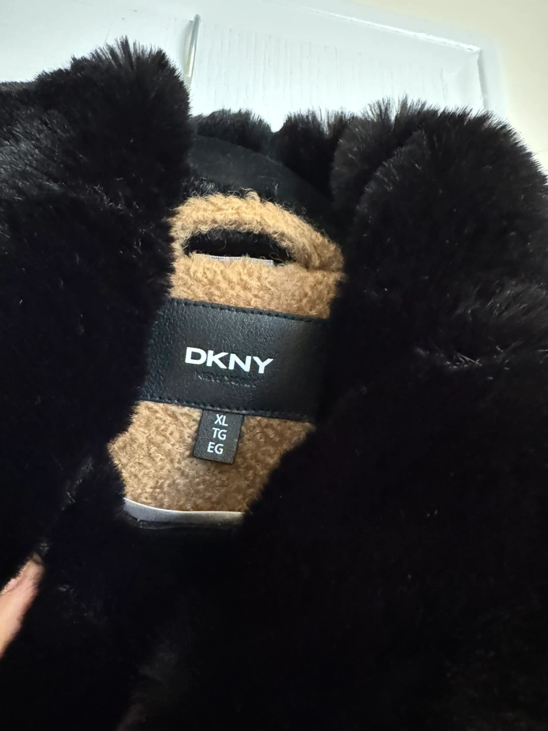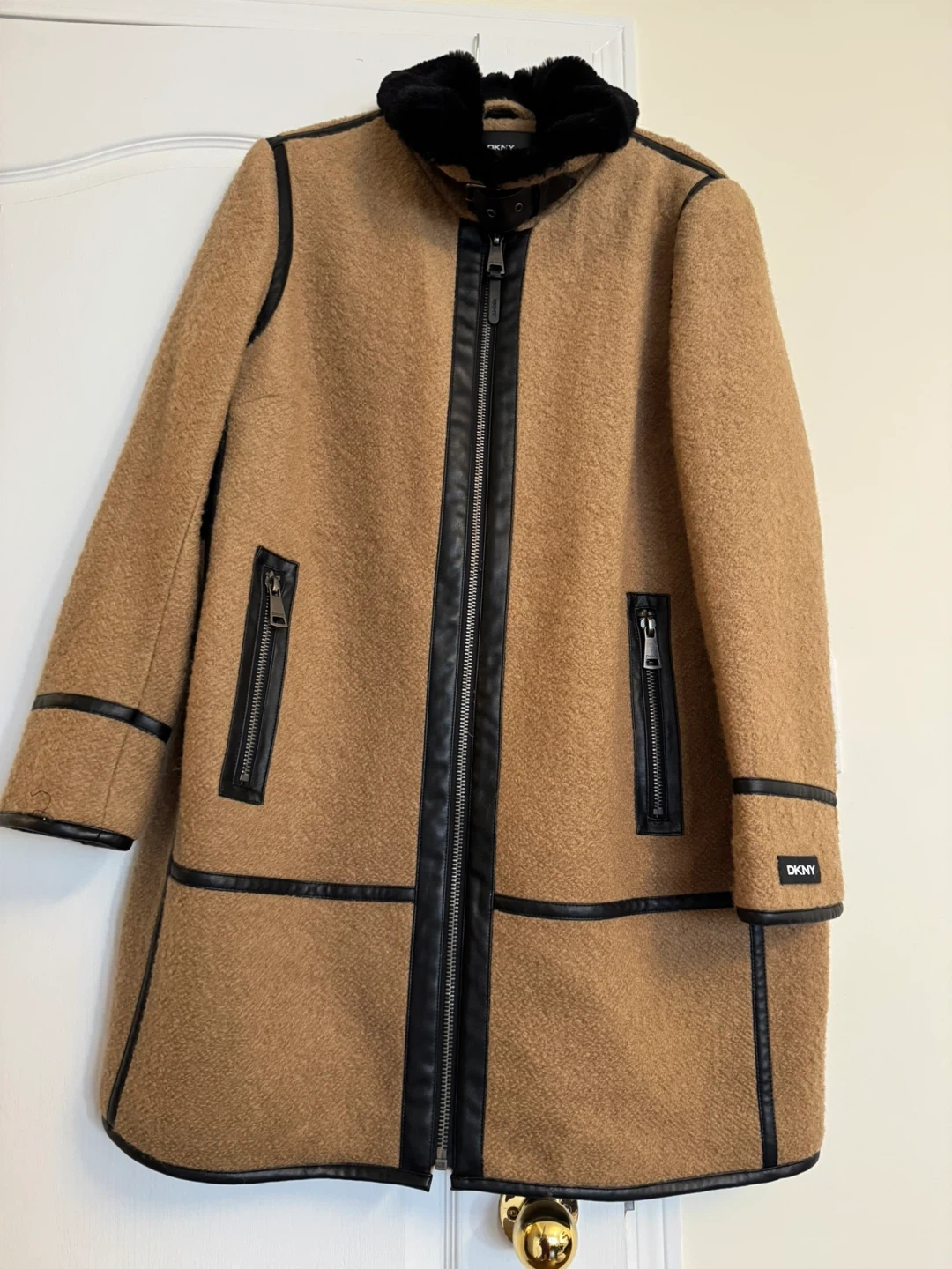 Selling a DKNY faux shearling coat in size XL. It's a tan/brown colour with black faux leather trim and a black faux fur collar. The coat features a zipper closure and zippered pockets. Great for cold weather!