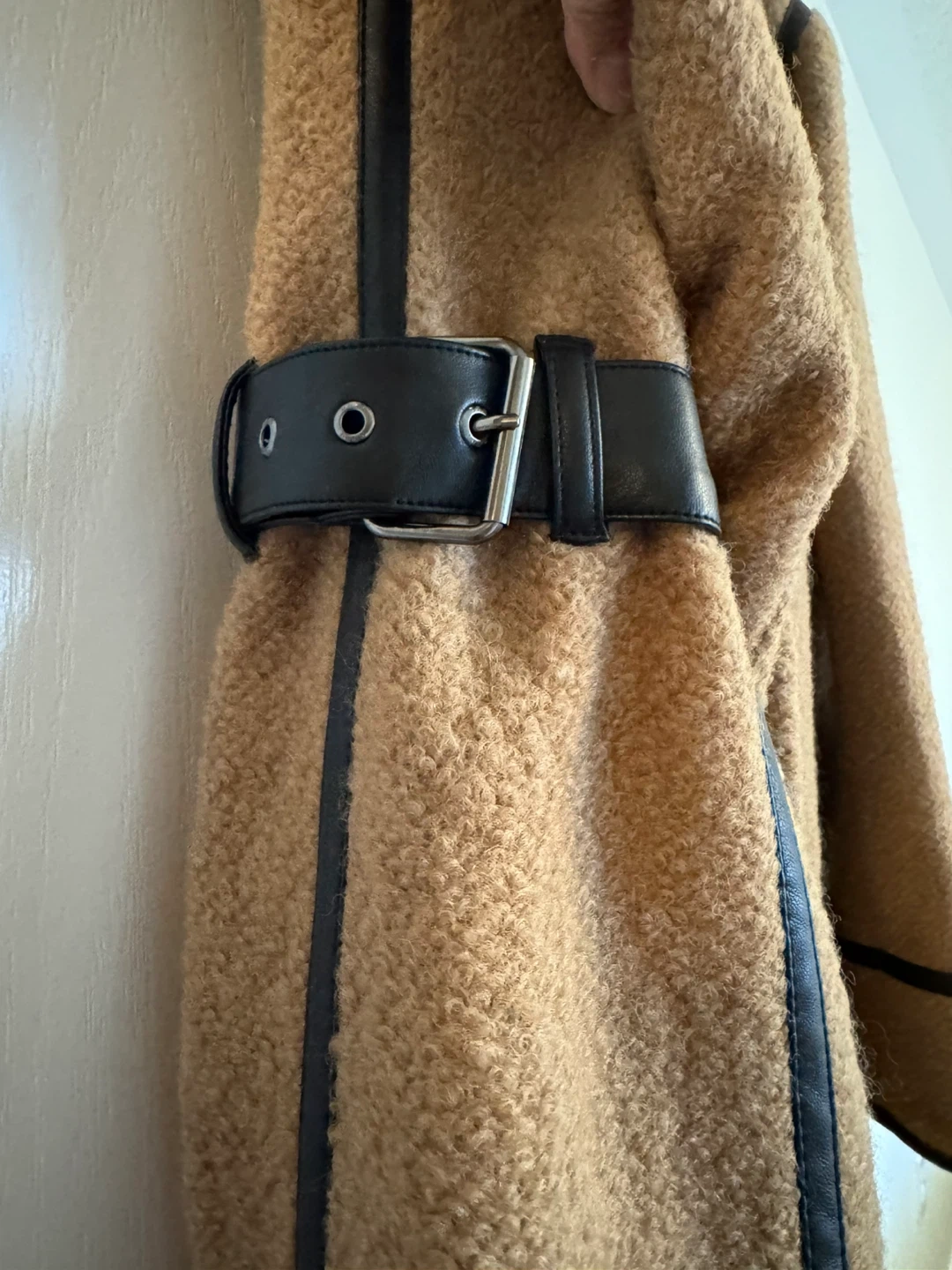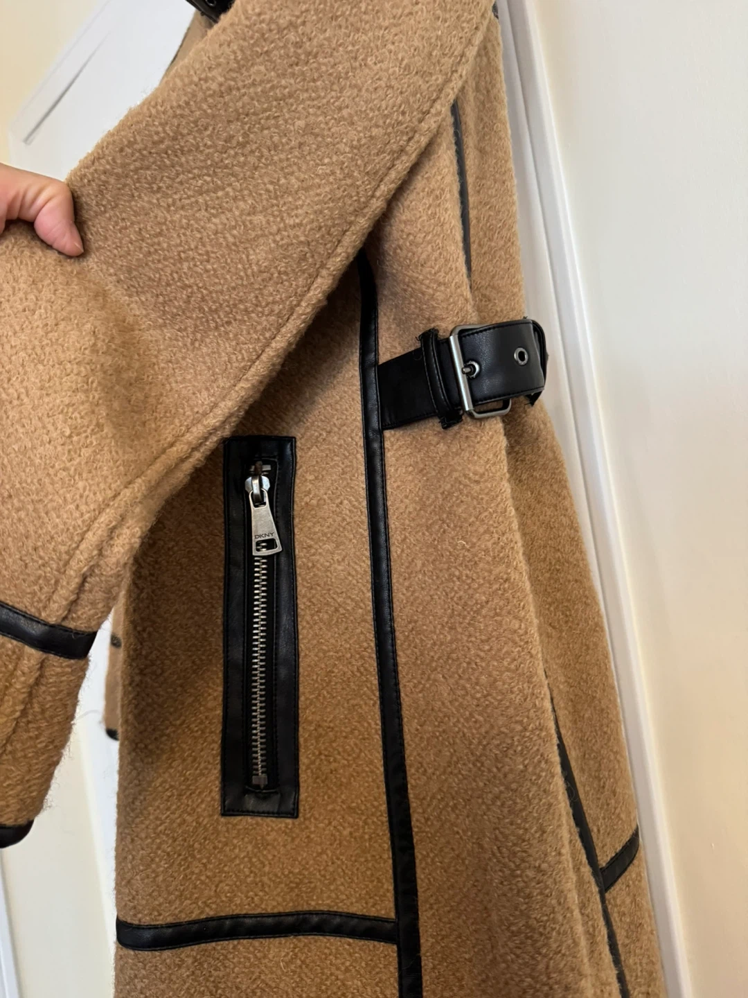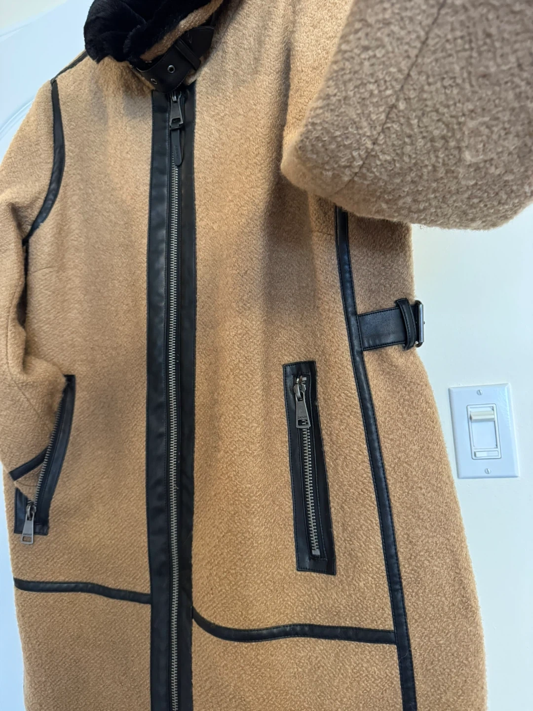 Selling a DKNY faux shearling coat in size XL. It's a tan/brown colour with black faux leather trim and a black faux fur collar. The coat features a zipper closure and zippered pockets. Great for cold weather!