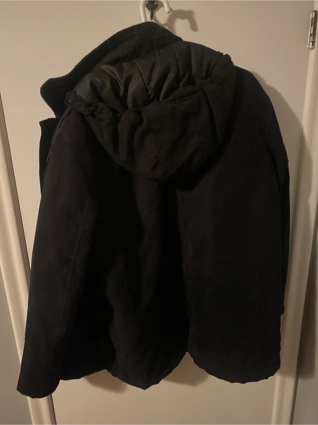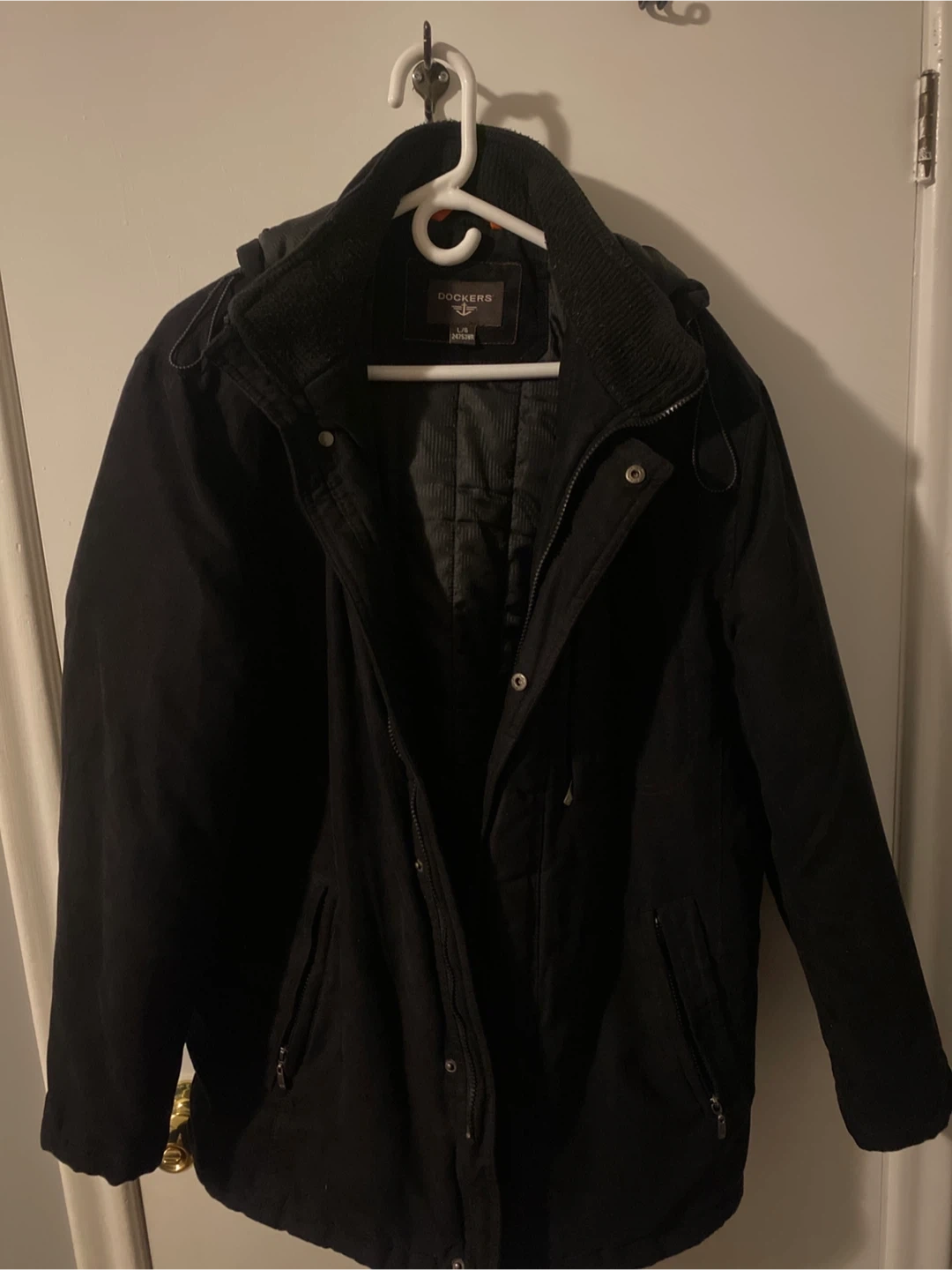 Selling a gently used Dockers winter jacket in black, size large. Material: - Shell: 100% Polyester - Lining: 100% Polyester - Interlining: 100% Polyester Machine wash in cool water, do not bleach