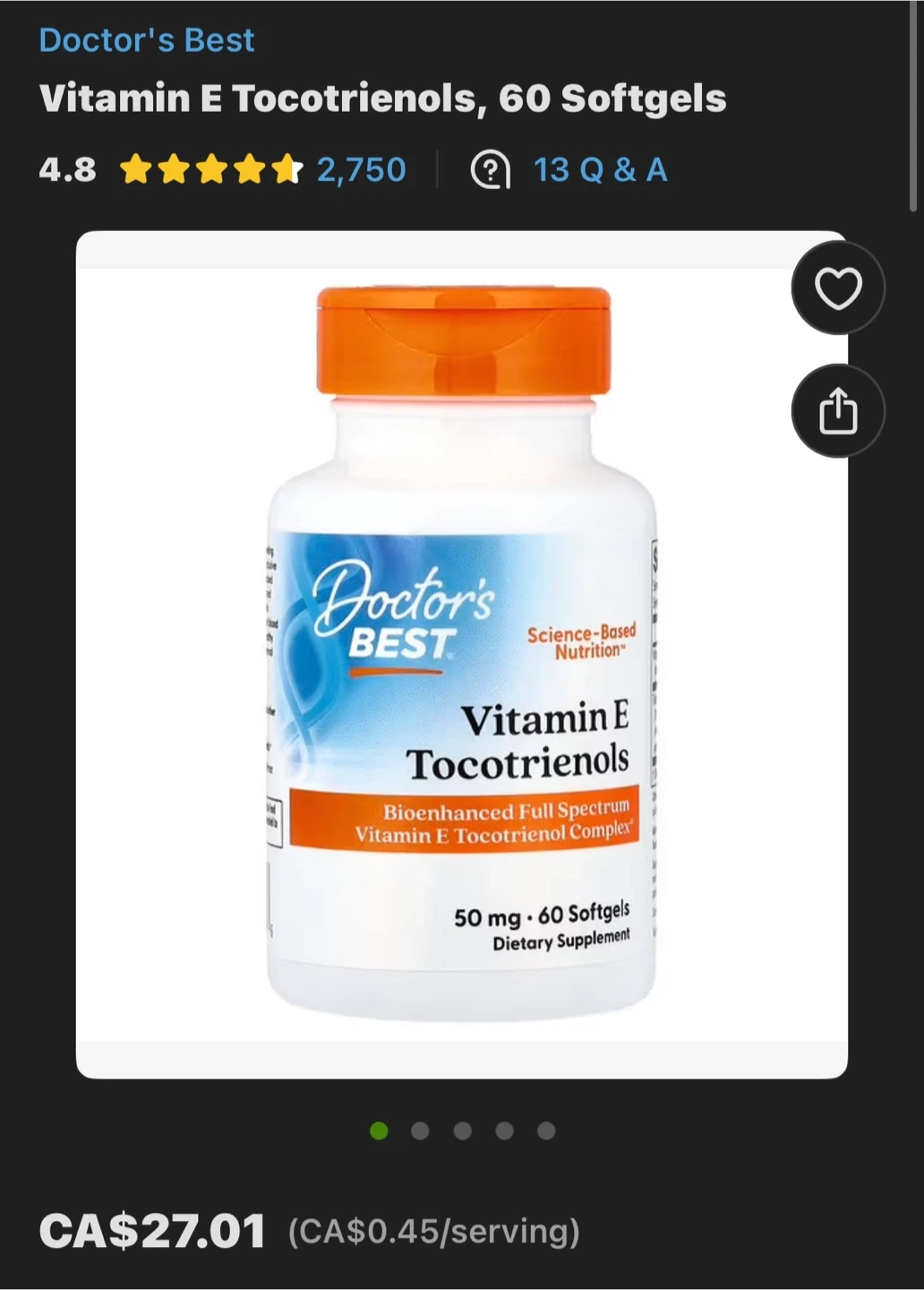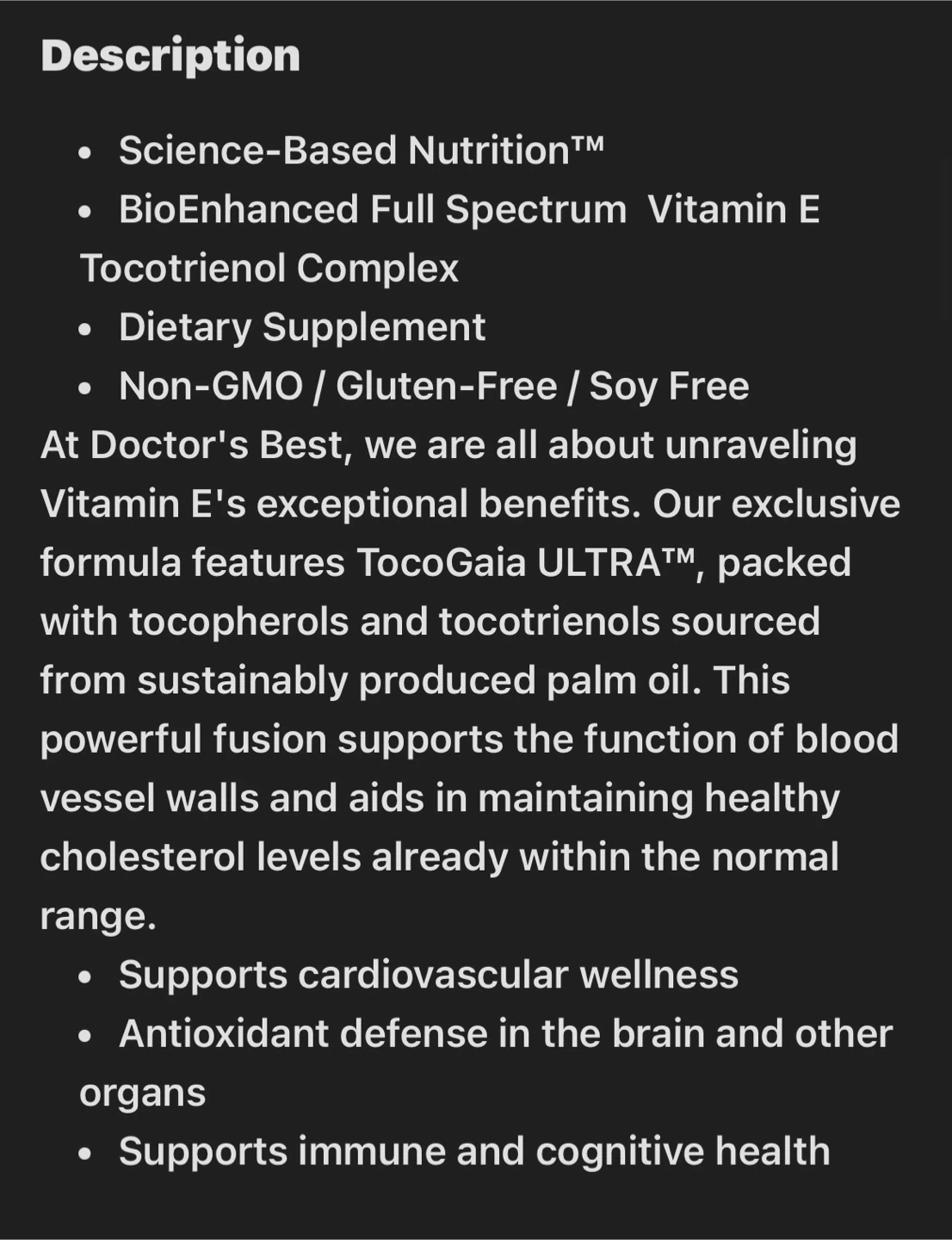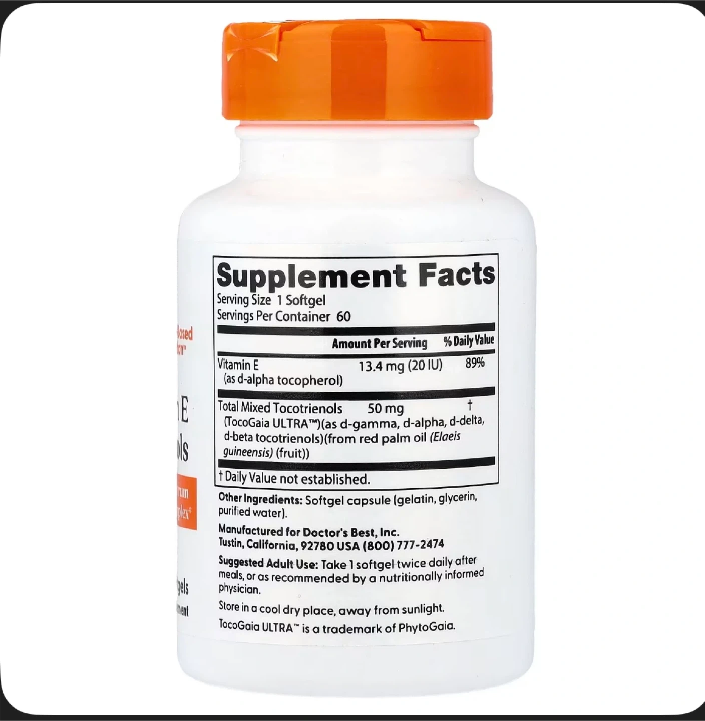 Selling a bottle of Doctor's Best Vitamin E Tocotrienols, containing 60 softgels. - Package quantity: 60 Count - Dimensions: 9.7 x 5.5 x 5.3 cm, 0.06 kg - Best before: July 2027 Adults can take 1 softgel twice daily after meals, or as recommended by a physician