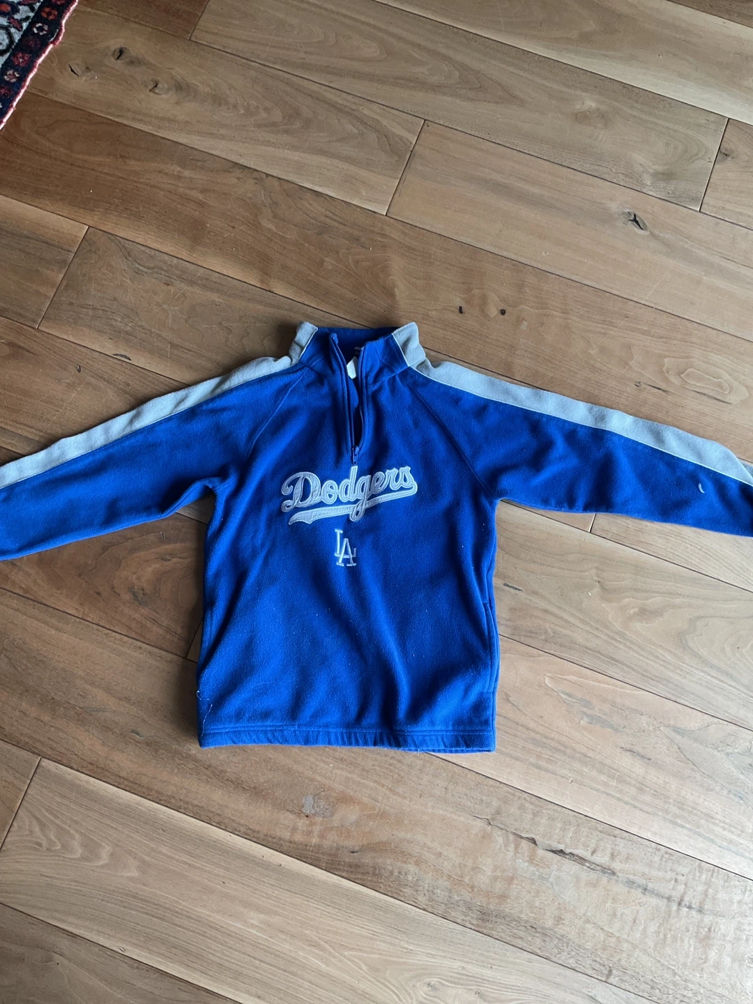 Youth-sized blue fleece pullover with the Dodgers logo. It's in good condition and perfect for keeping warm during those chilly evenings at the ballpark or just hanging out