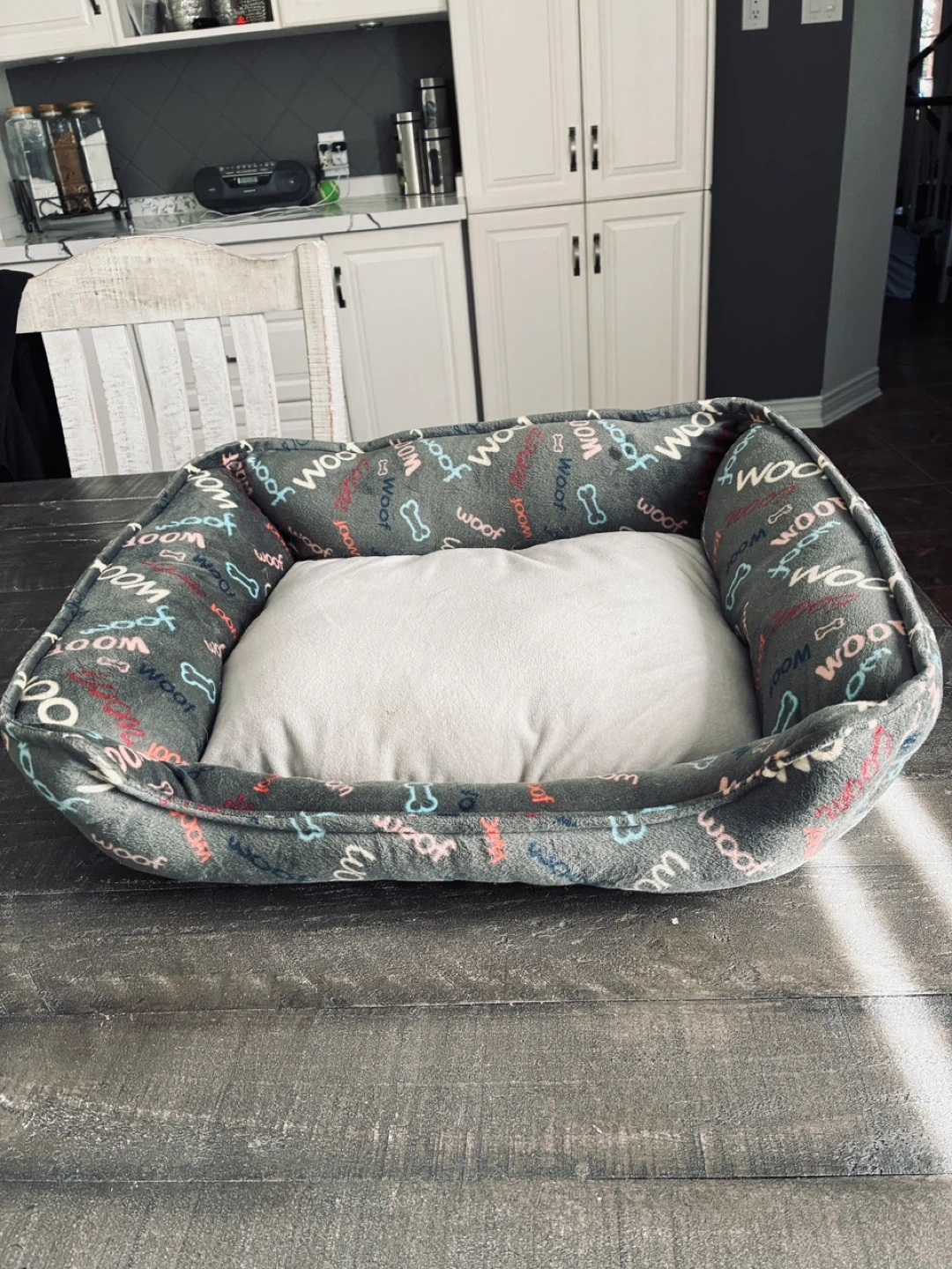 Cozy dog bed with a fun 'woof' pattern! It's in great shape and ready for a furry friend to enjoy. The bed has a soft, neutral-coloured cushion inside for extra comfort. Perfect for small to medium-sized dogs. 18” x 22”