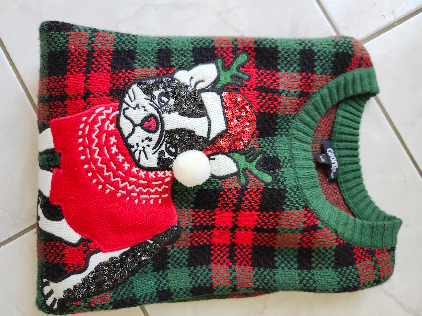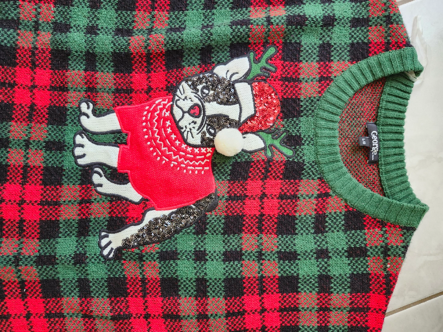 Get ready for the holidays with this adorable Christmas sweater! It features a cute dog design on a green and red plaid background. Size Women's L Washed in non-toxic detergent and hung to dry. Not worn outside of trying on.