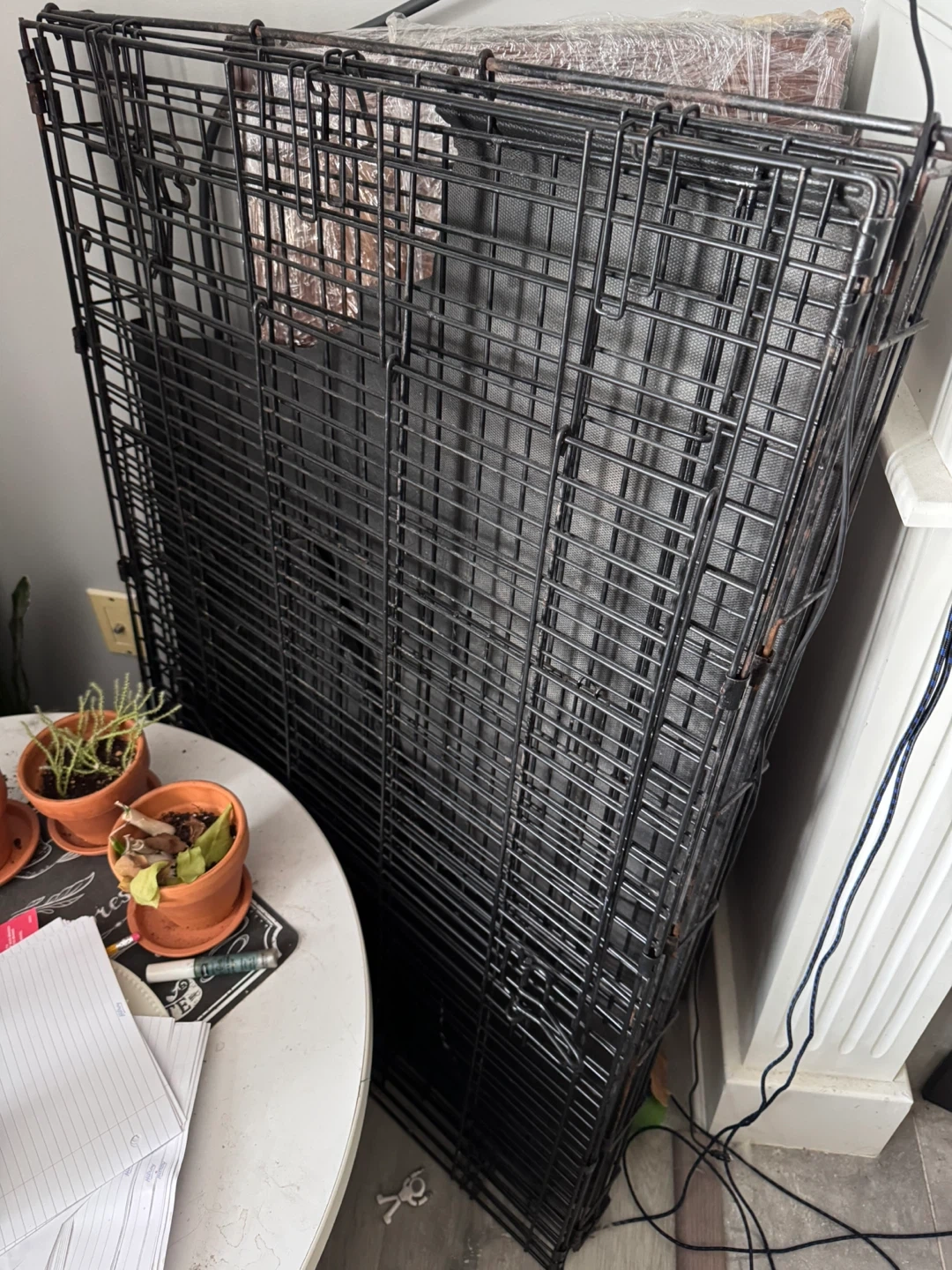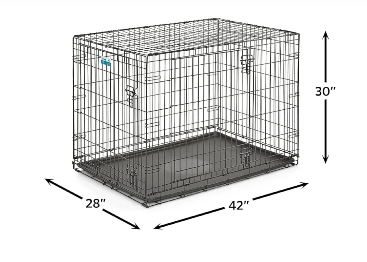 Selling a used dog crate. It's in good condition and measures approximately 42 inches long, 28 inches wide, and 30 inches tall with 2 doors. It's perfect for my Siberian Husky