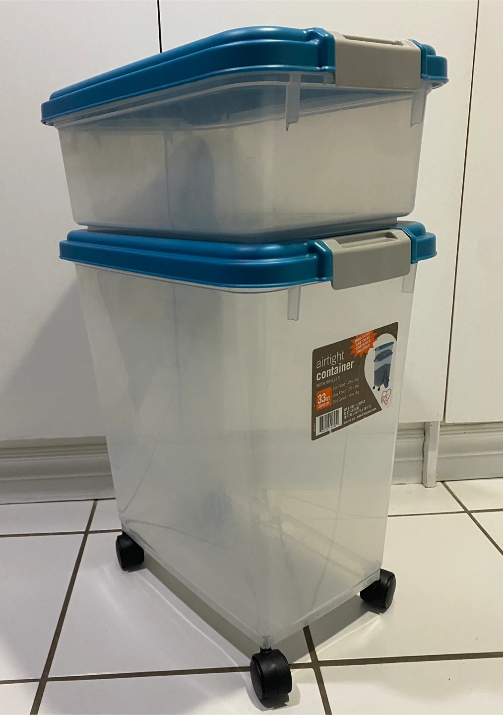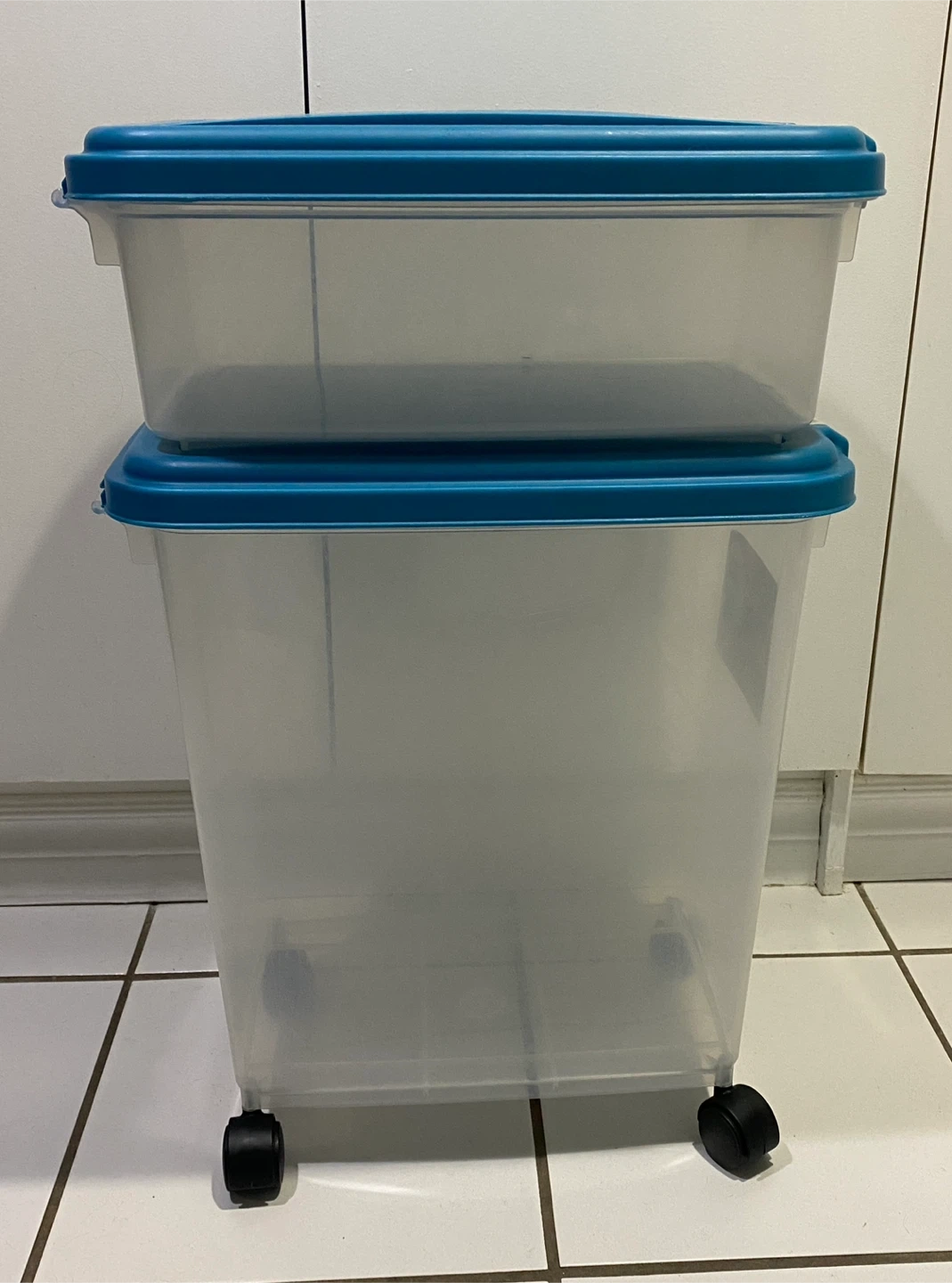 Dog food containers. Rated for 25lbs of dog food but can store 35-40lbs between the two containers. (~15kg bag) Matching measuring scoop included. These are in great condition, clean and functional. $20
