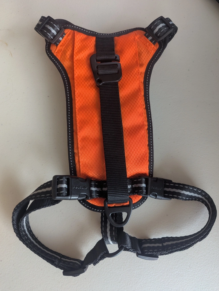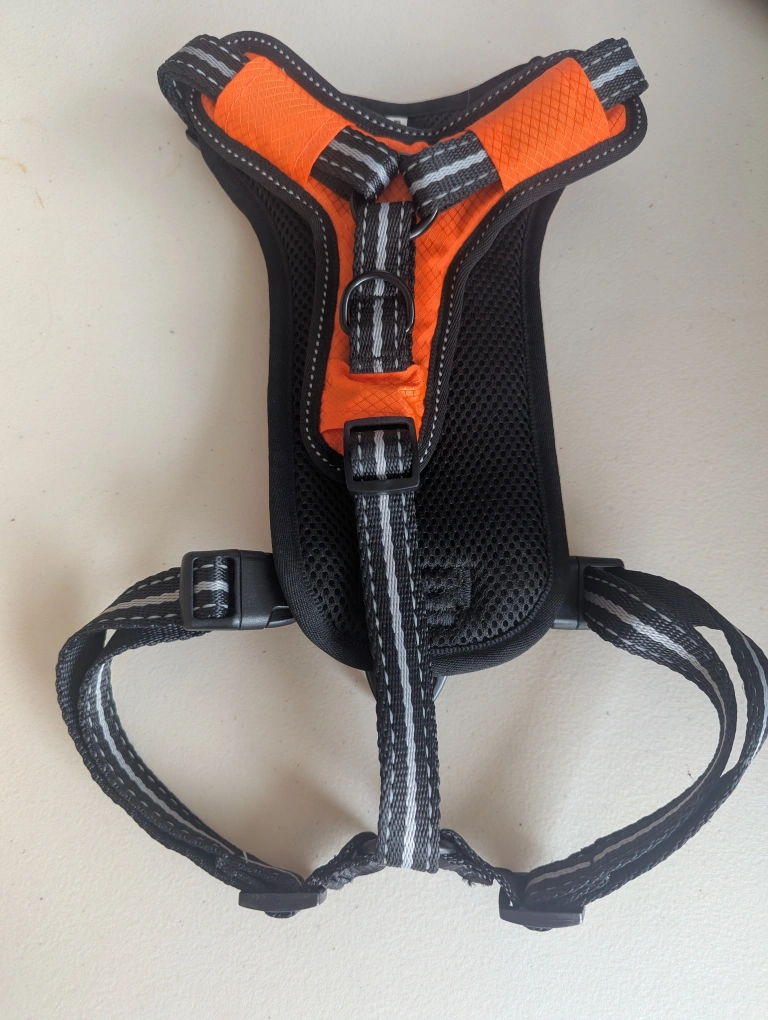 Selling a dog harness in orange and black. It's in great condition and ready for your furry friend's adventures! The harness features a comfortable design with adjustable straps for a secure fit