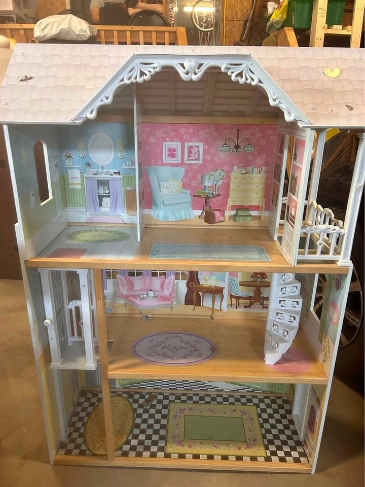 Wooden doll house with manual elevator and twisted staircase. Comes with furniture also.