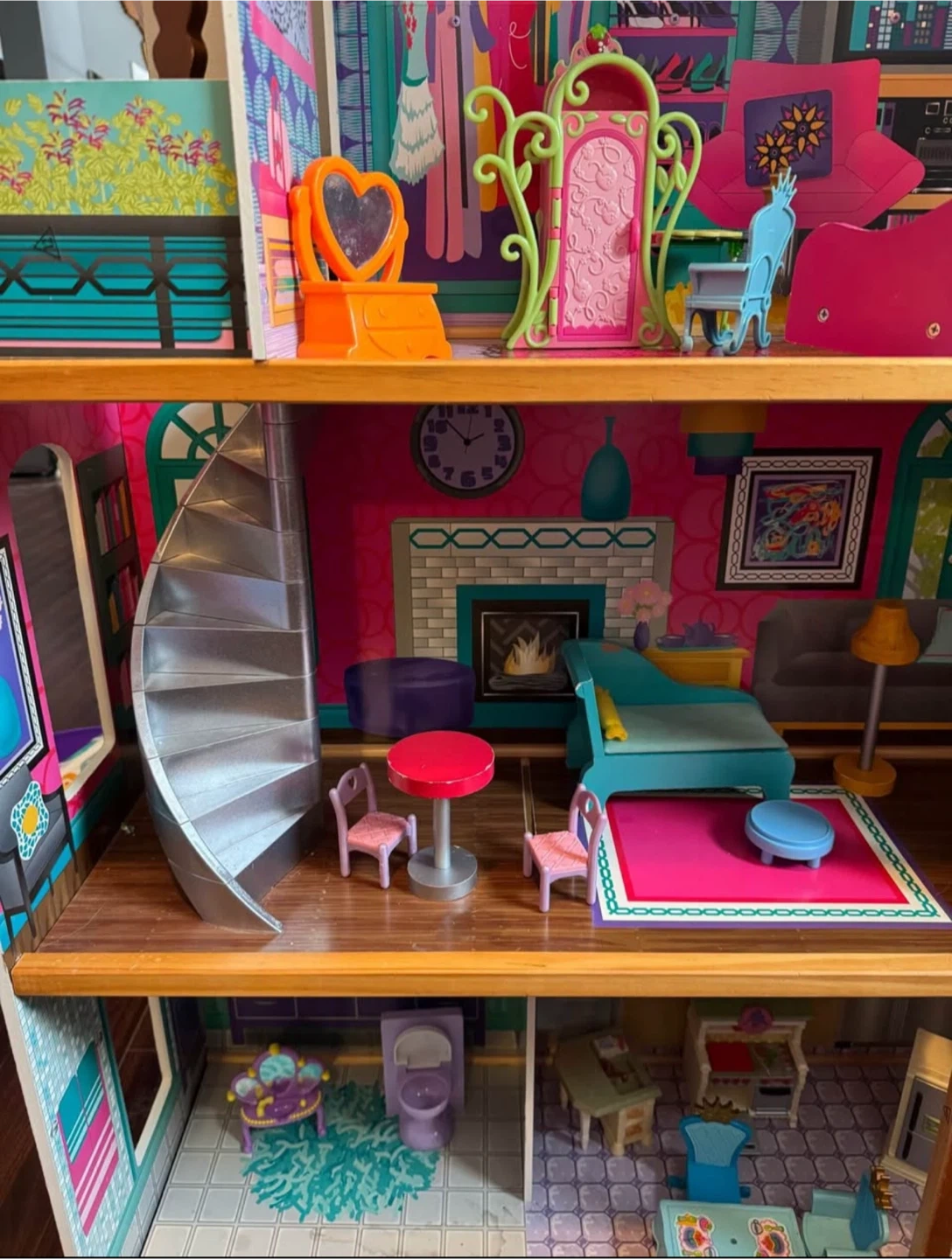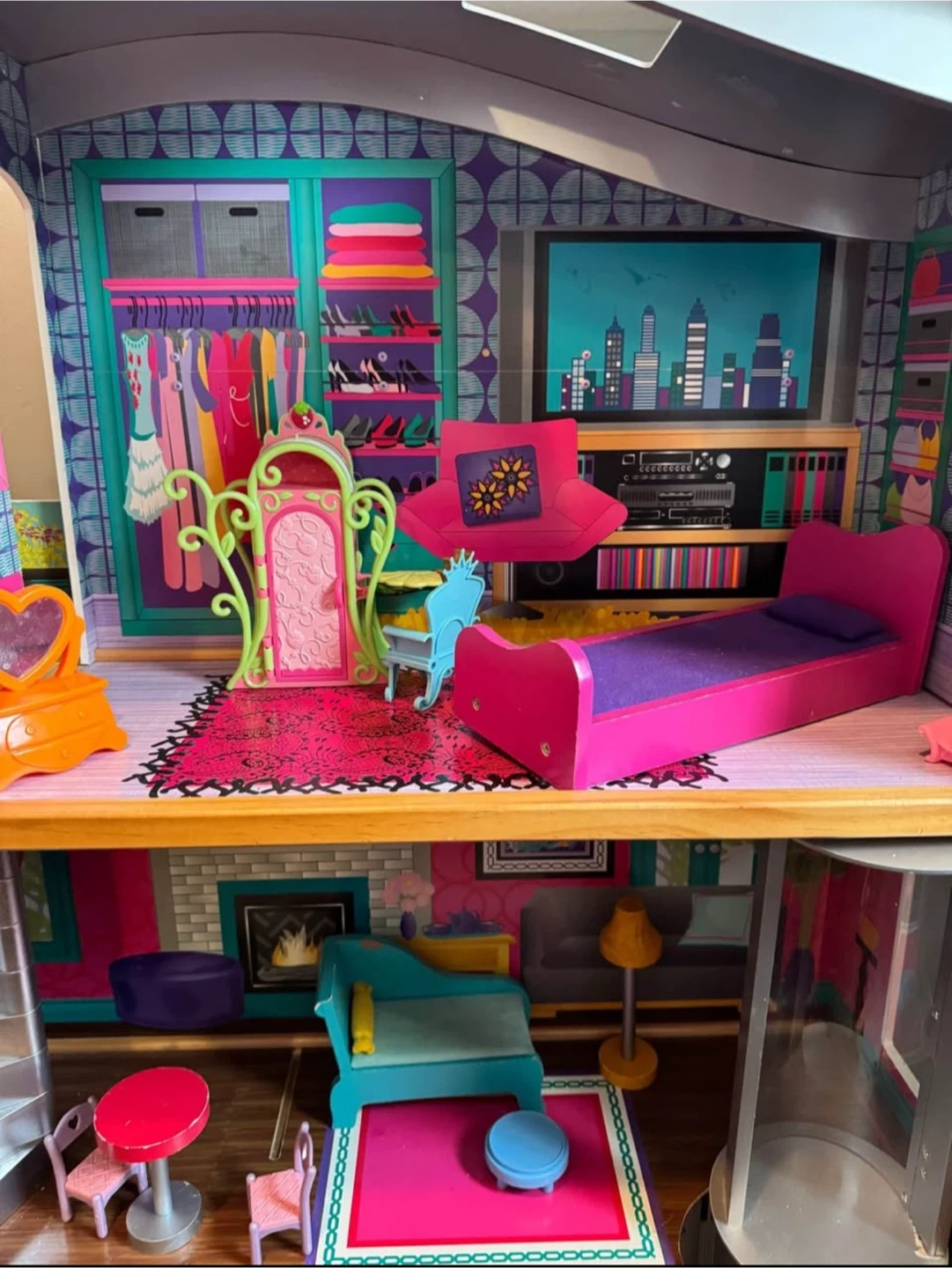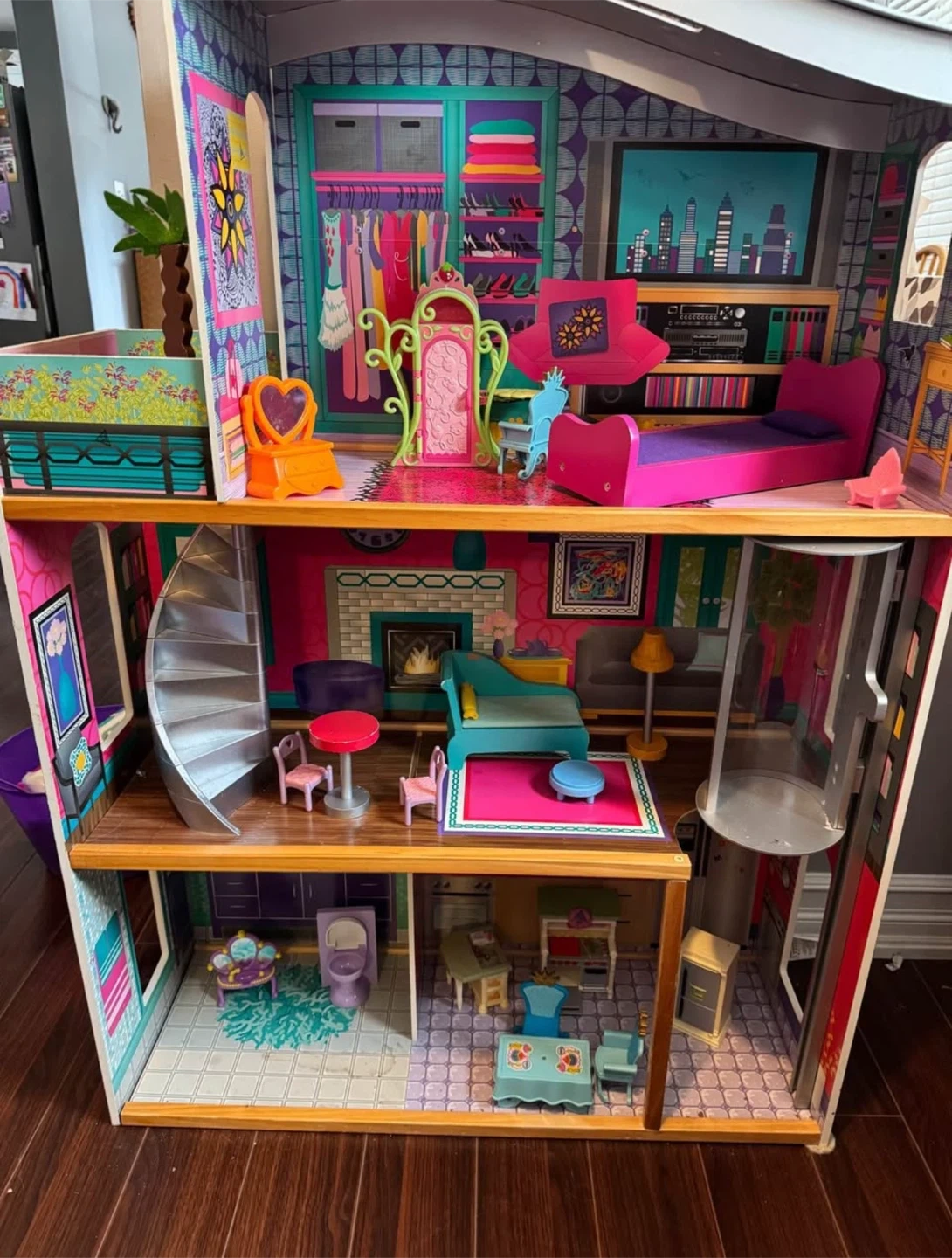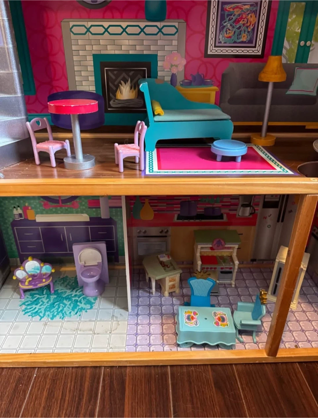 Selling a dollhouse that comes with furniture. It's in good condition and ready for a new home. It has a variety of rooms and furniture pieces, perfect for imaginative play! It’s in great condition
