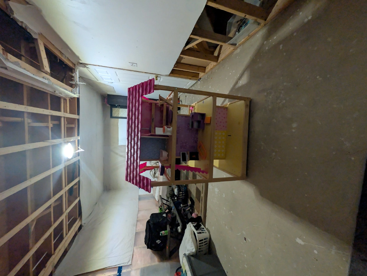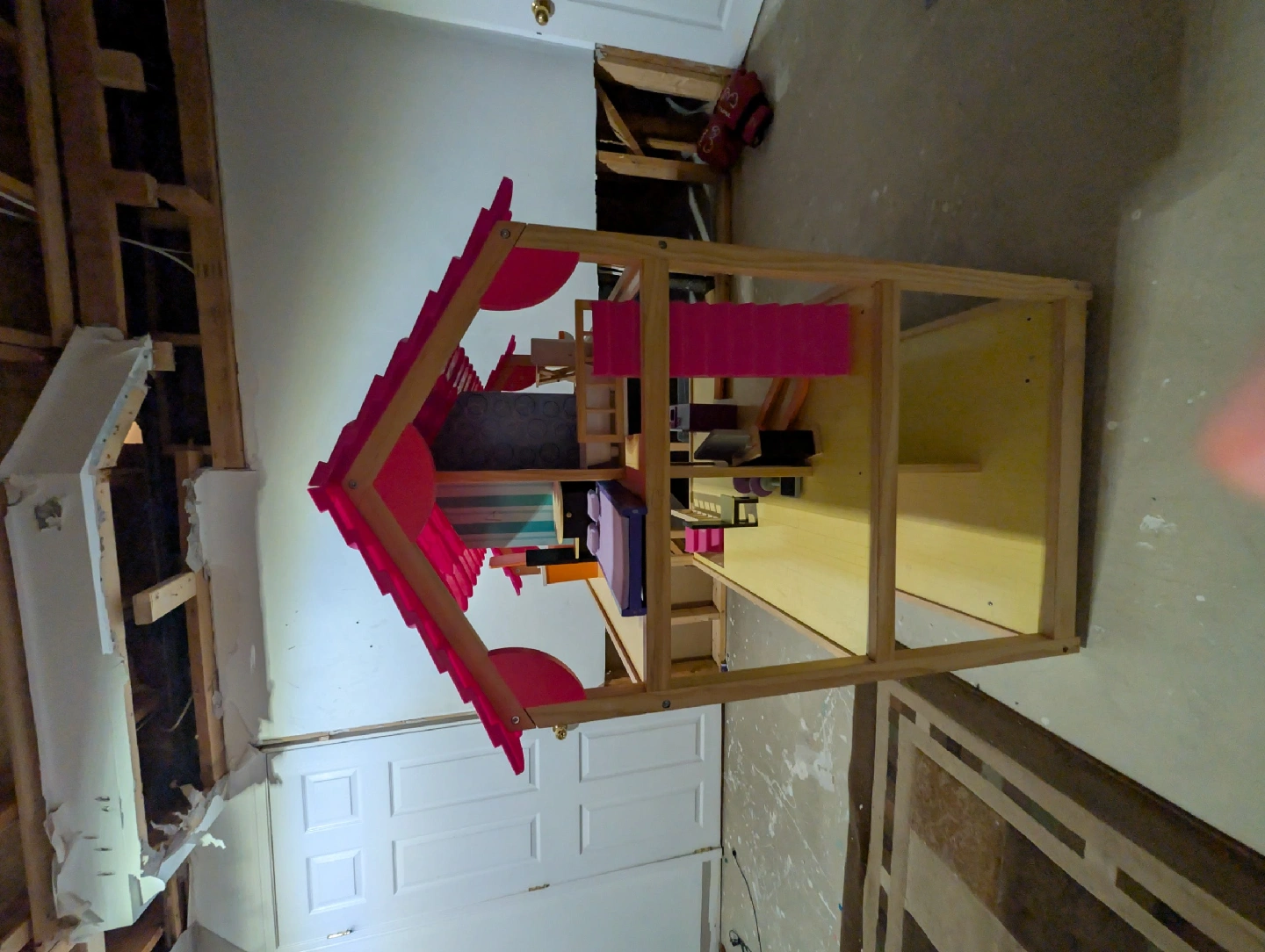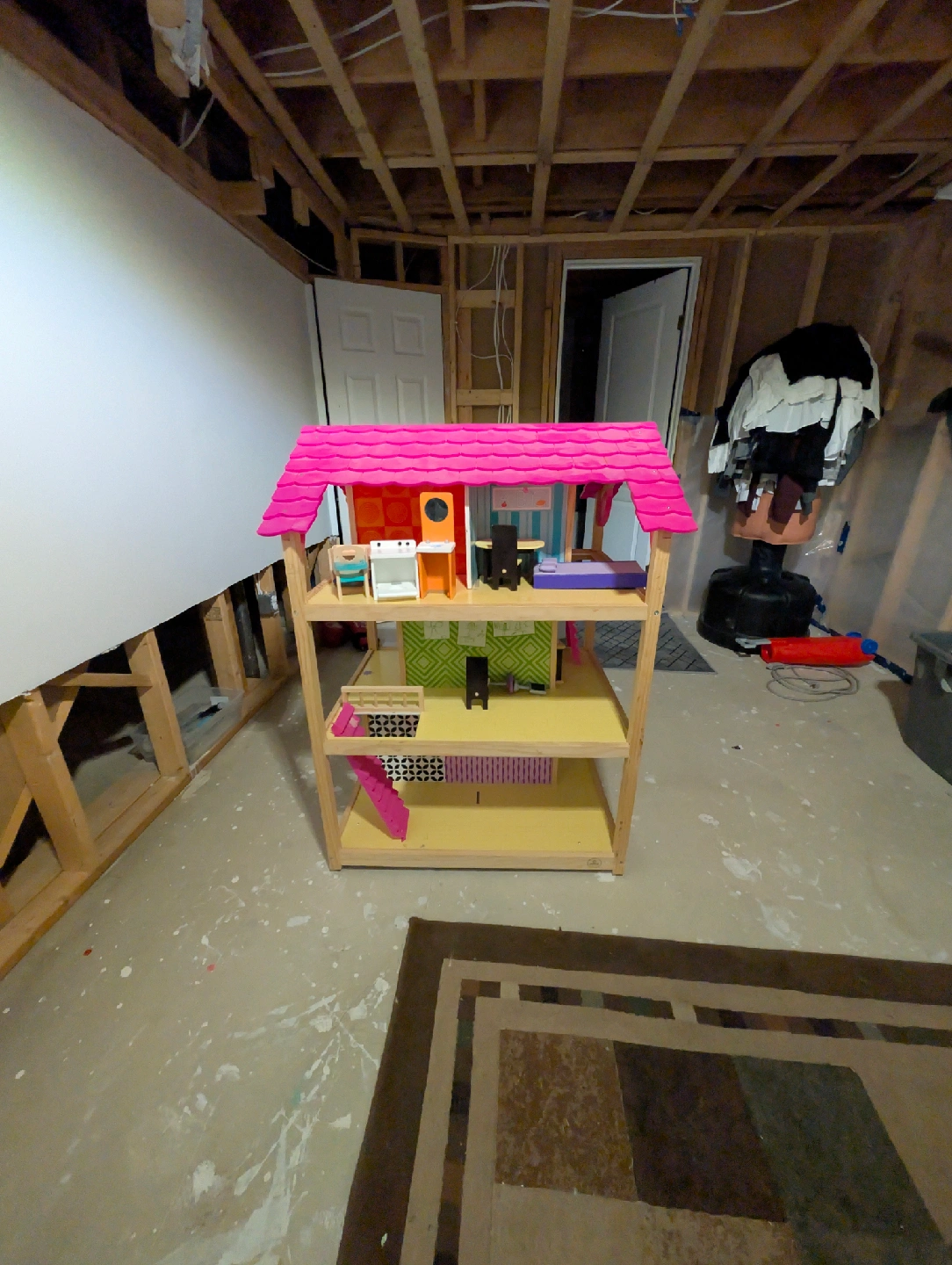 Selling a cute dollhouse with a bright pink roof! It has multiple levels for endless playtime fun. Perfect for any little one who loves imaginative play
