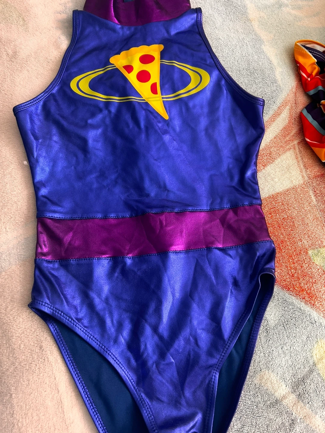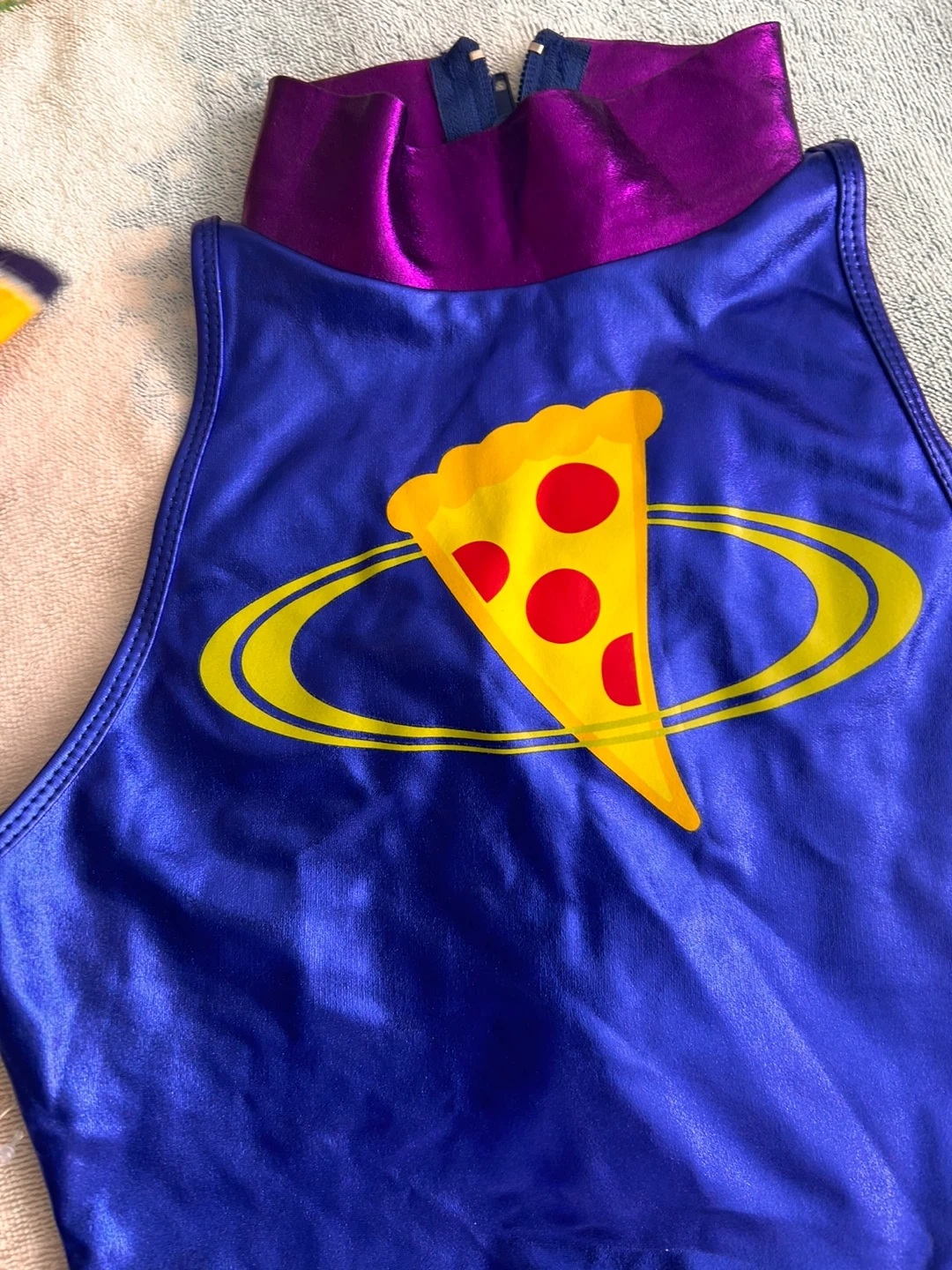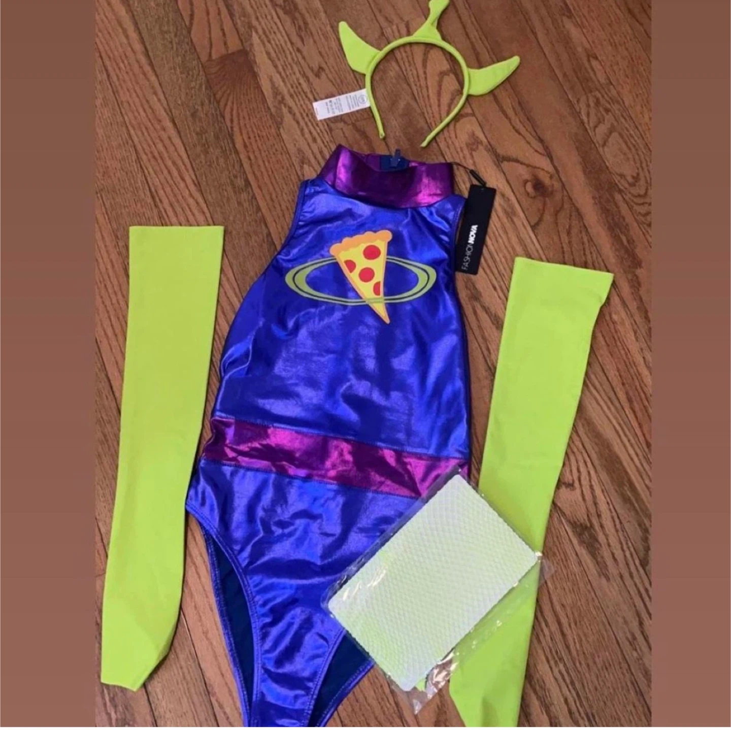 Get ready to turn heads with The Chosen One costume from Dolls Kill! This fun alien-inspired outfit includes a bodysuit with a pizza planet design, matching arm sleeves, and a headband. Perfect for Halloween or any costume party!