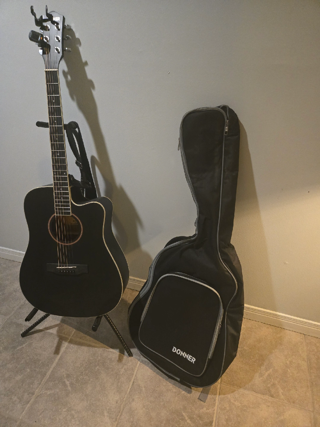 new donner guitar with strap, tuner, capo, heavy welded stand, soft case 120$