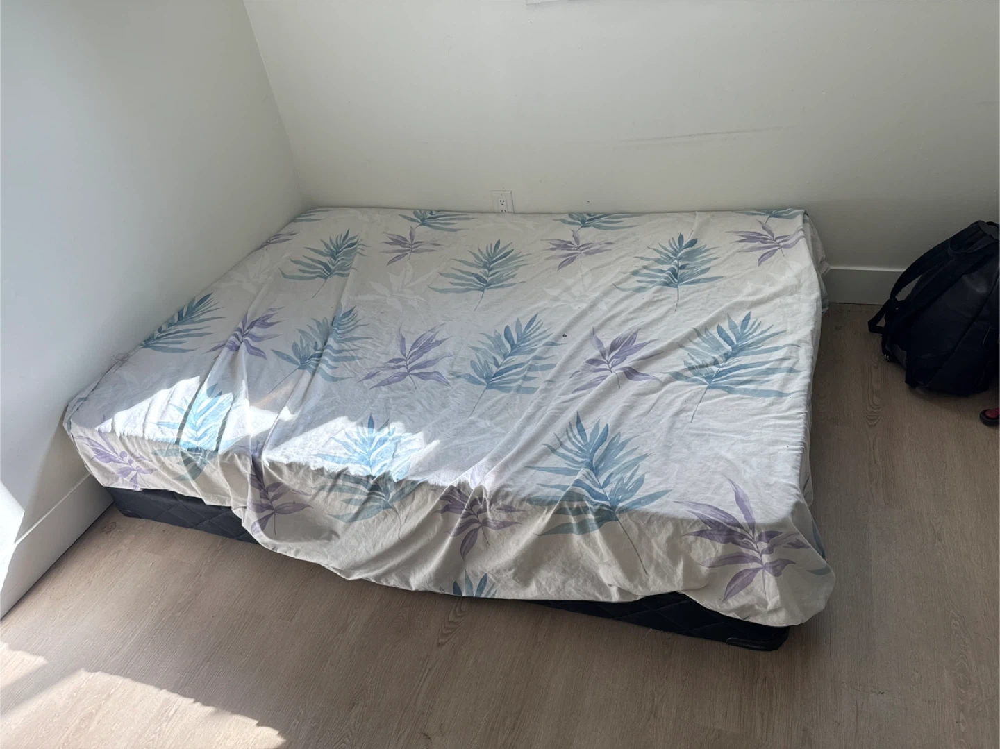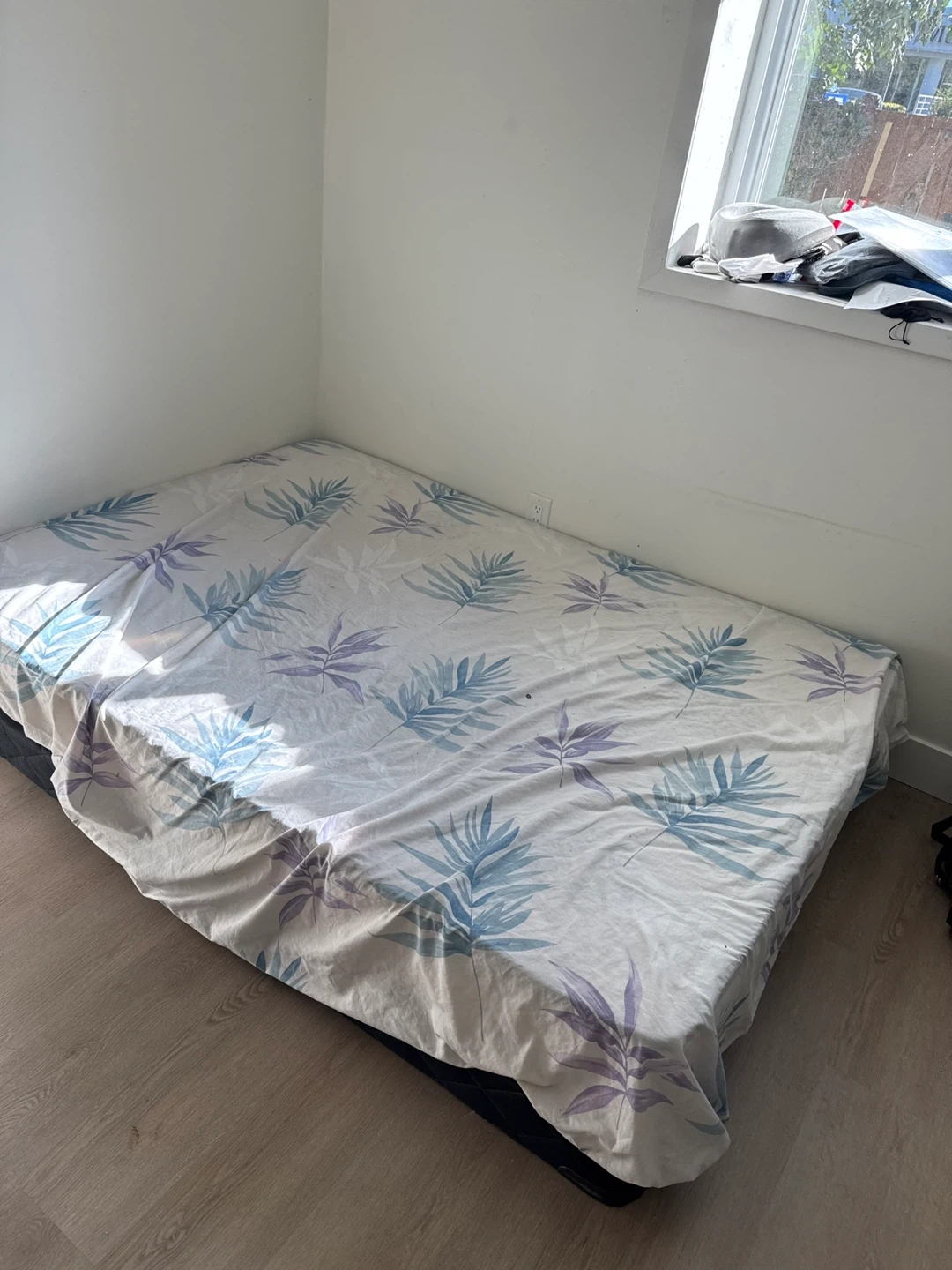 Selling a double mattress with bed frame , perfect for a guest room or small space! It's in good condition and has been well-maintained. A mattress cover with a leaf pattern is included!