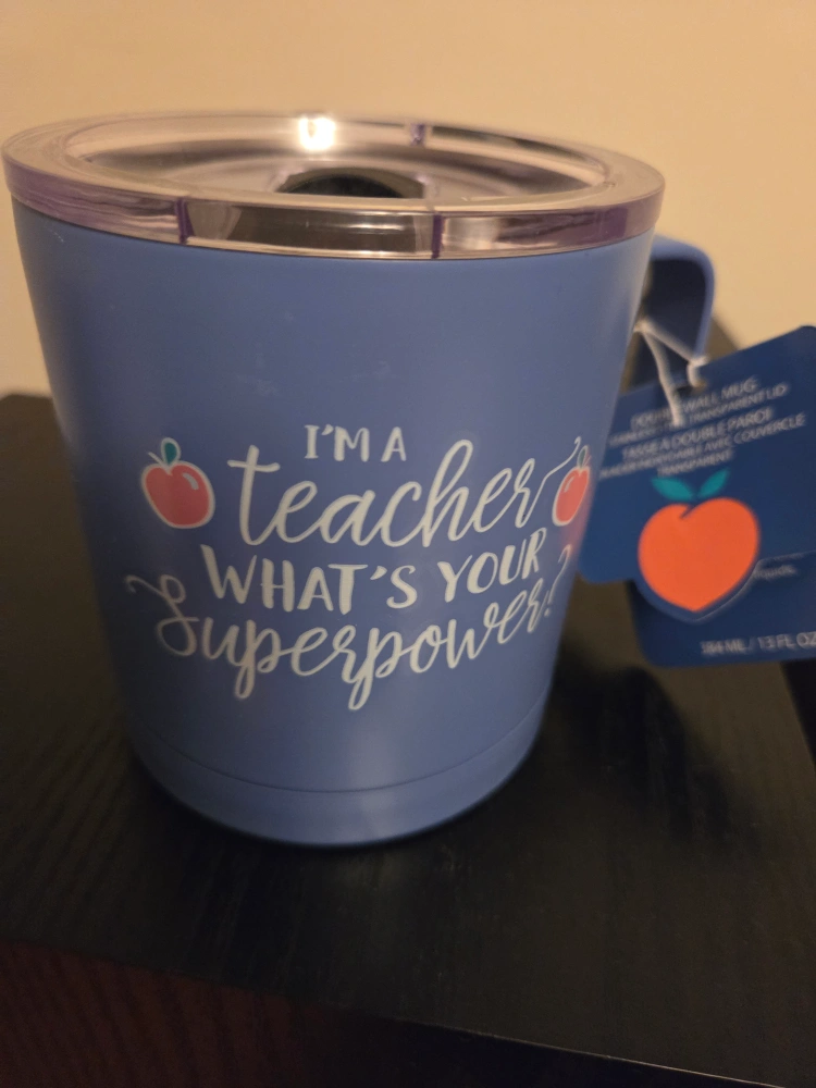 I'm selling a brand new double wall mug! It's a stainless steel transparent lid mug. It reads 'I'm a teacher, what's your superpower?' Perfect for any teacher!