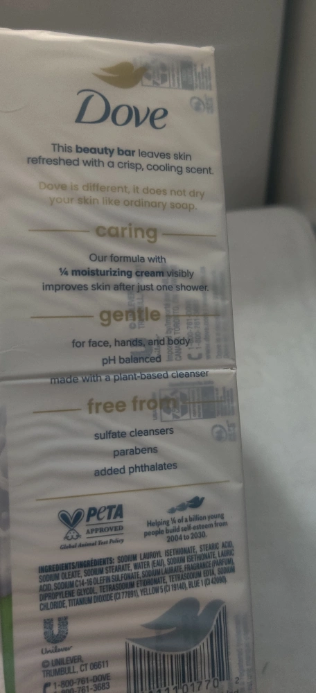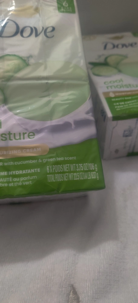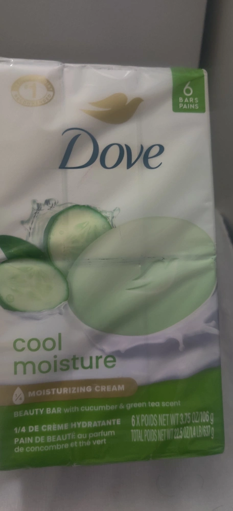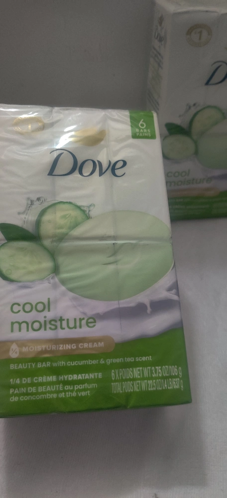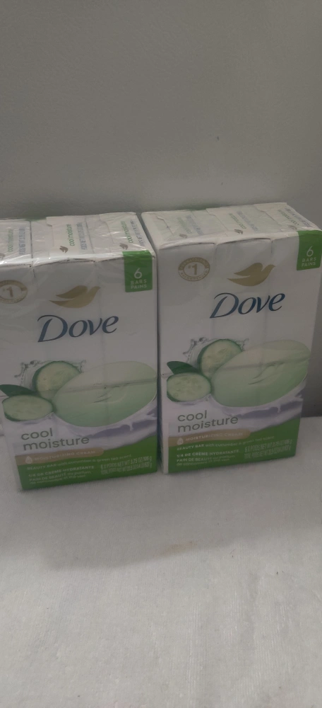Selling 2packs of Dove Cool Moisture beauty bars. Each pack contains 6 bars with cucumber and green tea scent. These beauty bars are gentle and made with a plant-based cleanser. They're also free from sulfate cleansers, parabens, and added phthalates, leaving your skin refreshed with a crisp, cooling scent