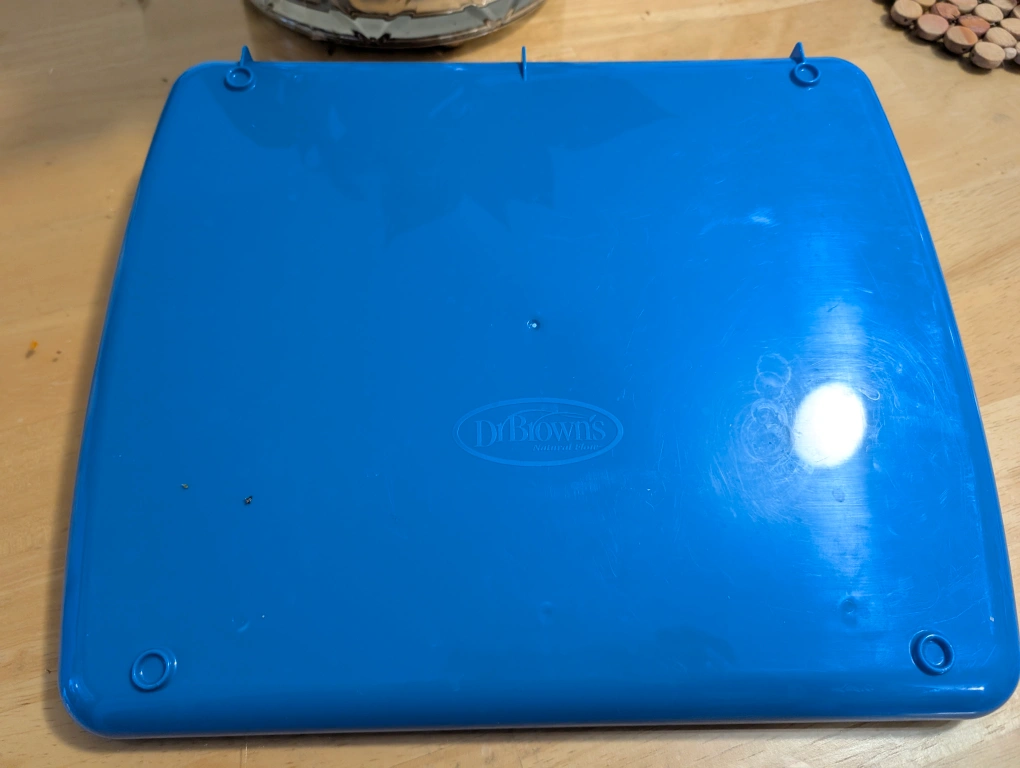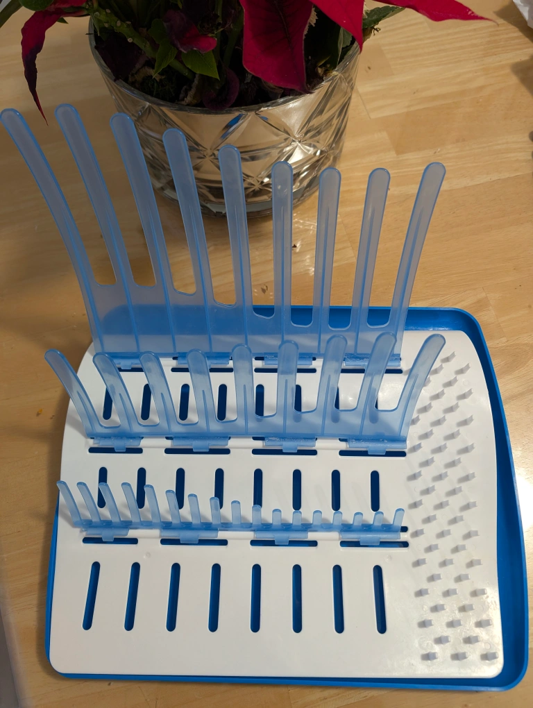 Baby bottle drying rack. Blue and white plastic. Multiple slots for bottles and other baby items. Pick up at Agincourt Mall. See my postings for other items.