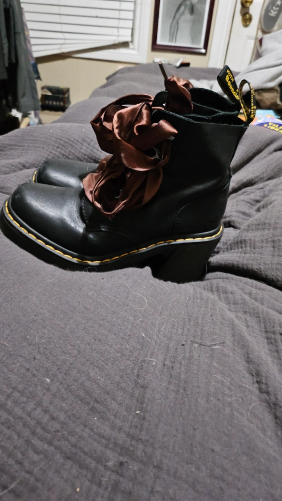 Selling a pair of Dr. Martens black leather boots. They have a unique style with brown thick ribbon laces and a heel. These boots are in good condition and ready for a new home! Available for pick-up near Oakwood Village.