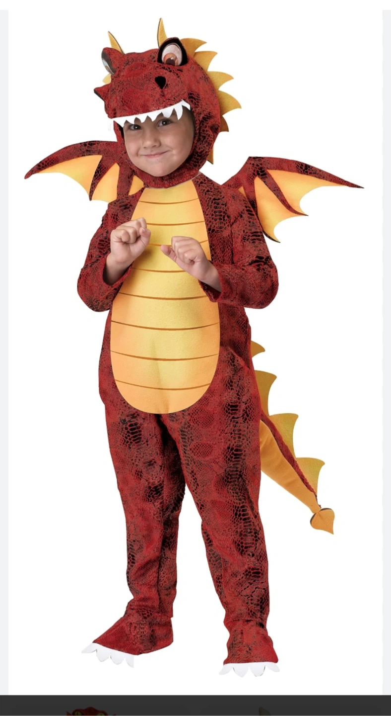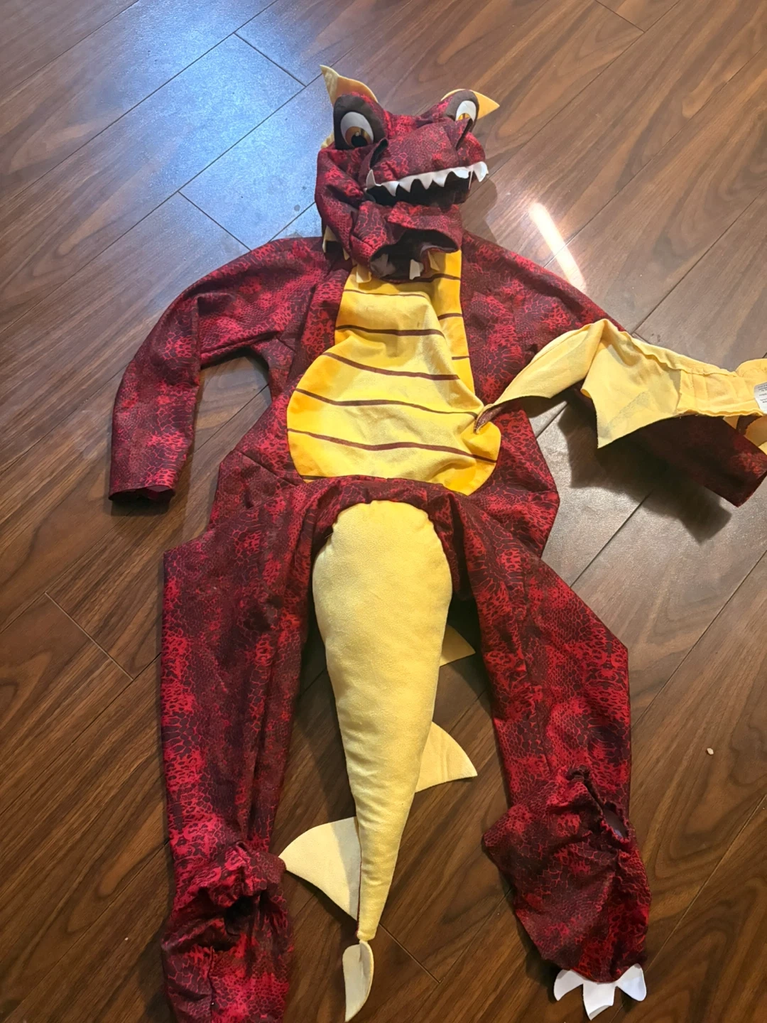 A fun dragon costume for kids! It's red and yellow and in good condition. Perfect for dress-up or Halloween