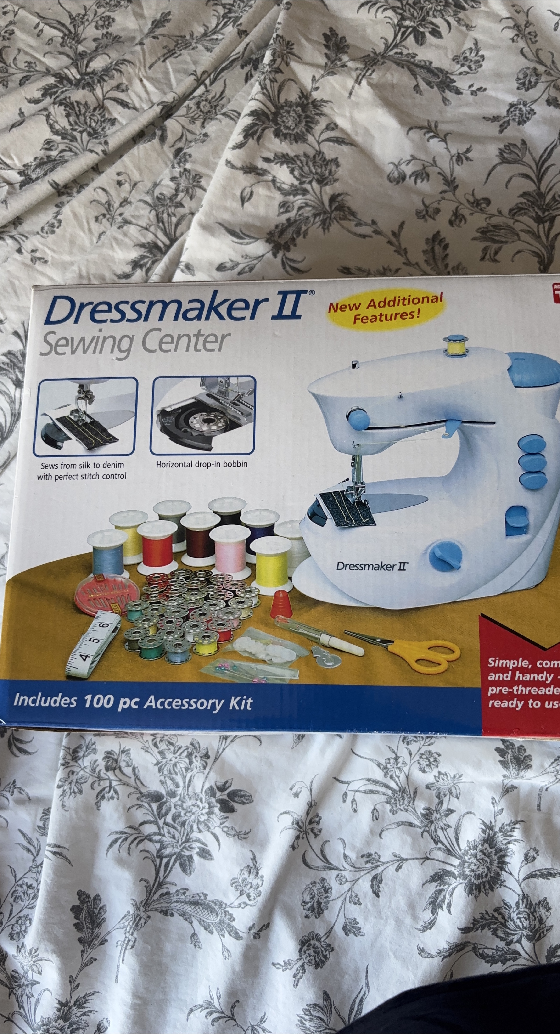 Selling a Dressmaker II Sewing Center! It sews from silk to denim with perfect stitch control. It also has a horizontal drop-in bobbin. The box says it includes a 100 piece accessory kit and has some new additional features!