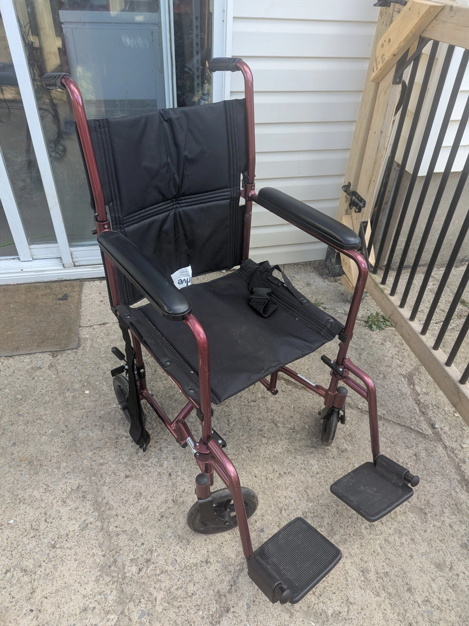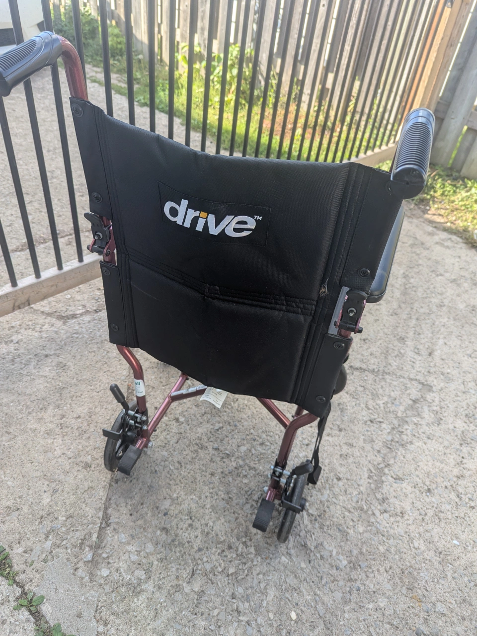 Selling a Drive lightweight transport wheelchair in good condition! It's easy to fold and transport, making it great for getting around. The chair has a sturdy frame and comfortable seating.