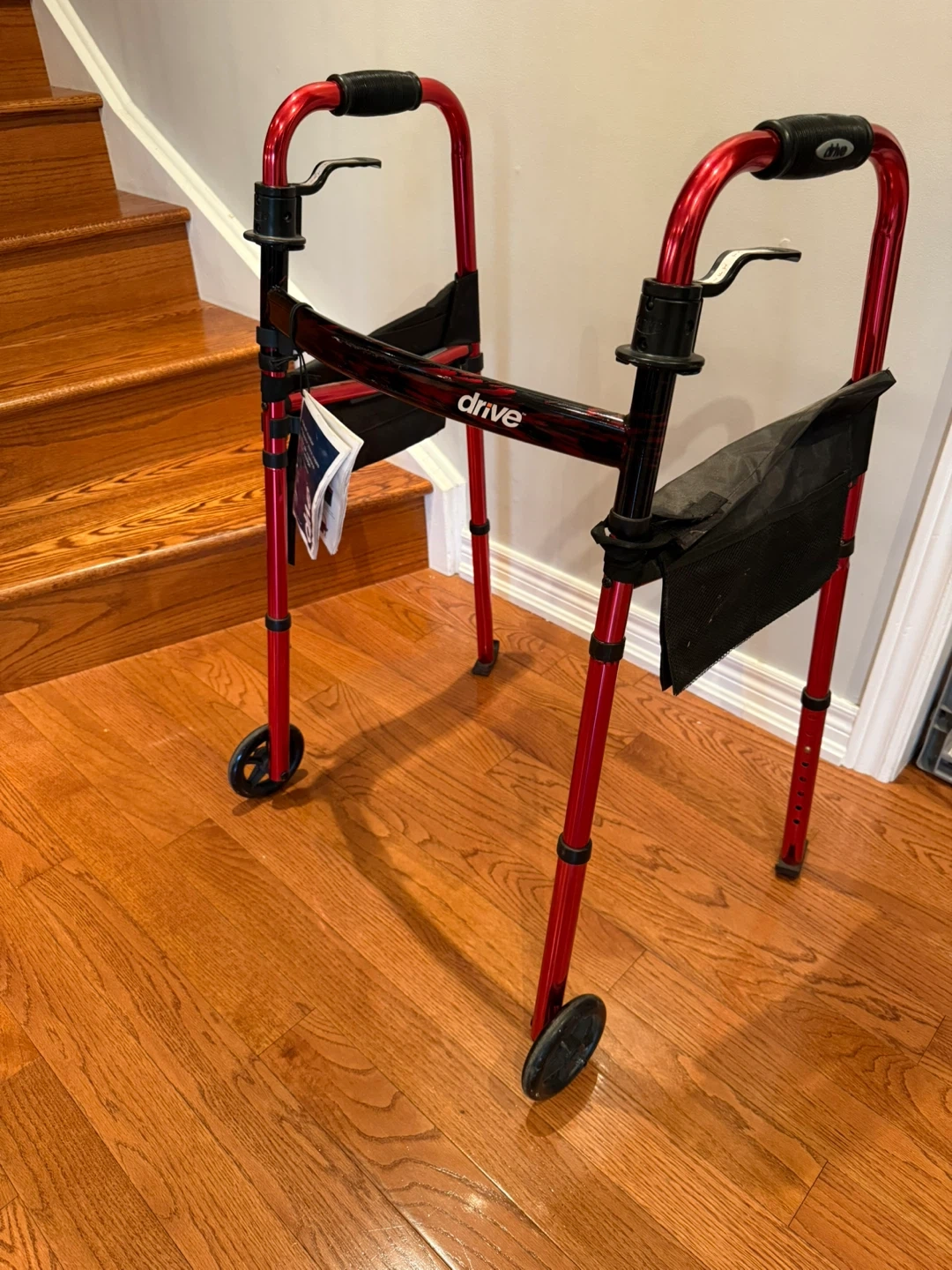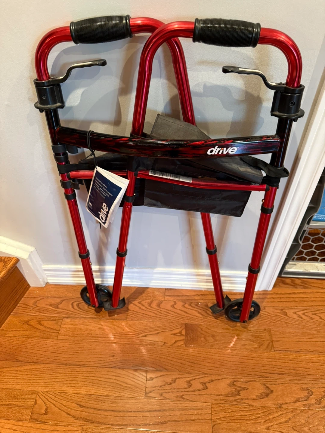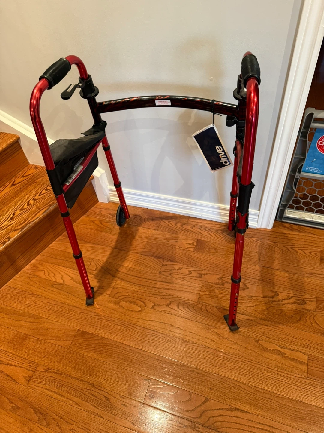 Selling a Drive folding walker in red. It's in great condition and ready to help someone get around. It features a convenient folding design for easy storage and transport. Perfect for indoor or outdoor use! Comes with wheels. Adjustable height. Two side pockets for carrying your personal items.