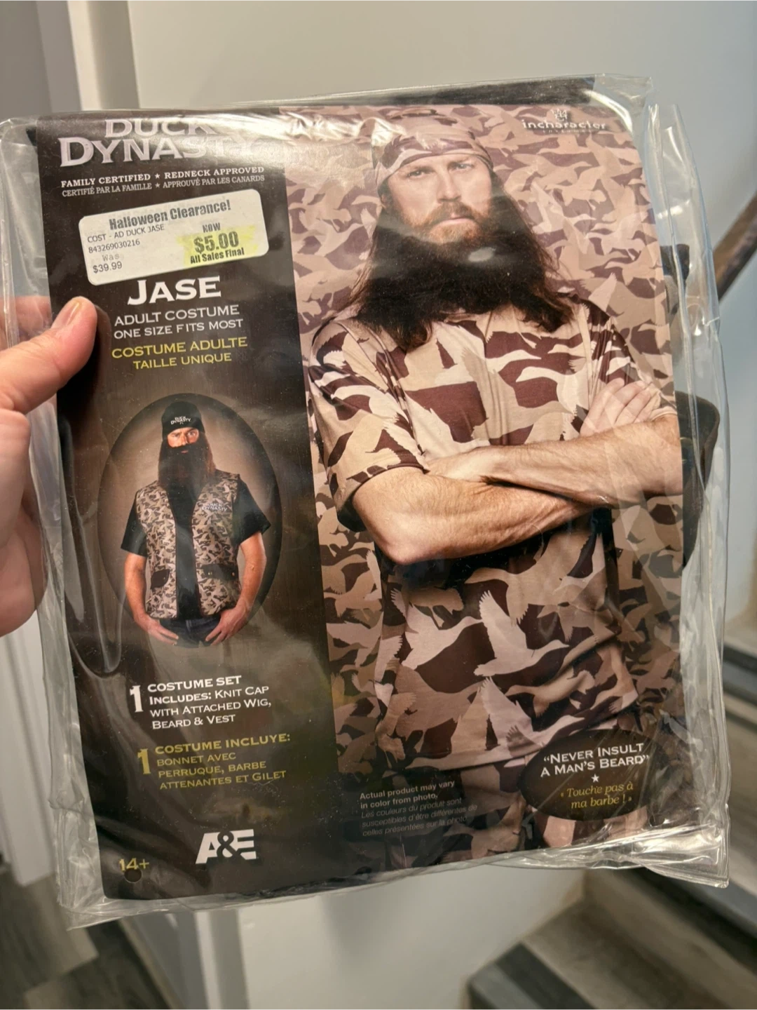 Selling a brand new Duck Dynasty Jase costume! It comes in its original packaging and includes: - Costume set with attached wig, beard & vest - Costume (bonnet & barbe, perruque & gilet) Perfect for Halloween or a themed party