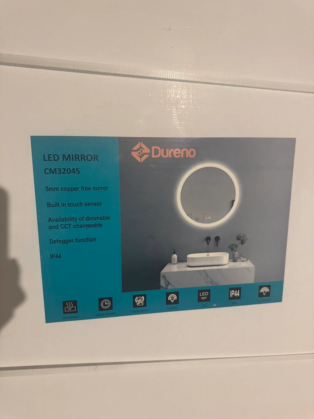 5mm copper free mirror. Built-in touch sensor. Dimmable and CCT Defogger function. IP44 rating. 32 inches.