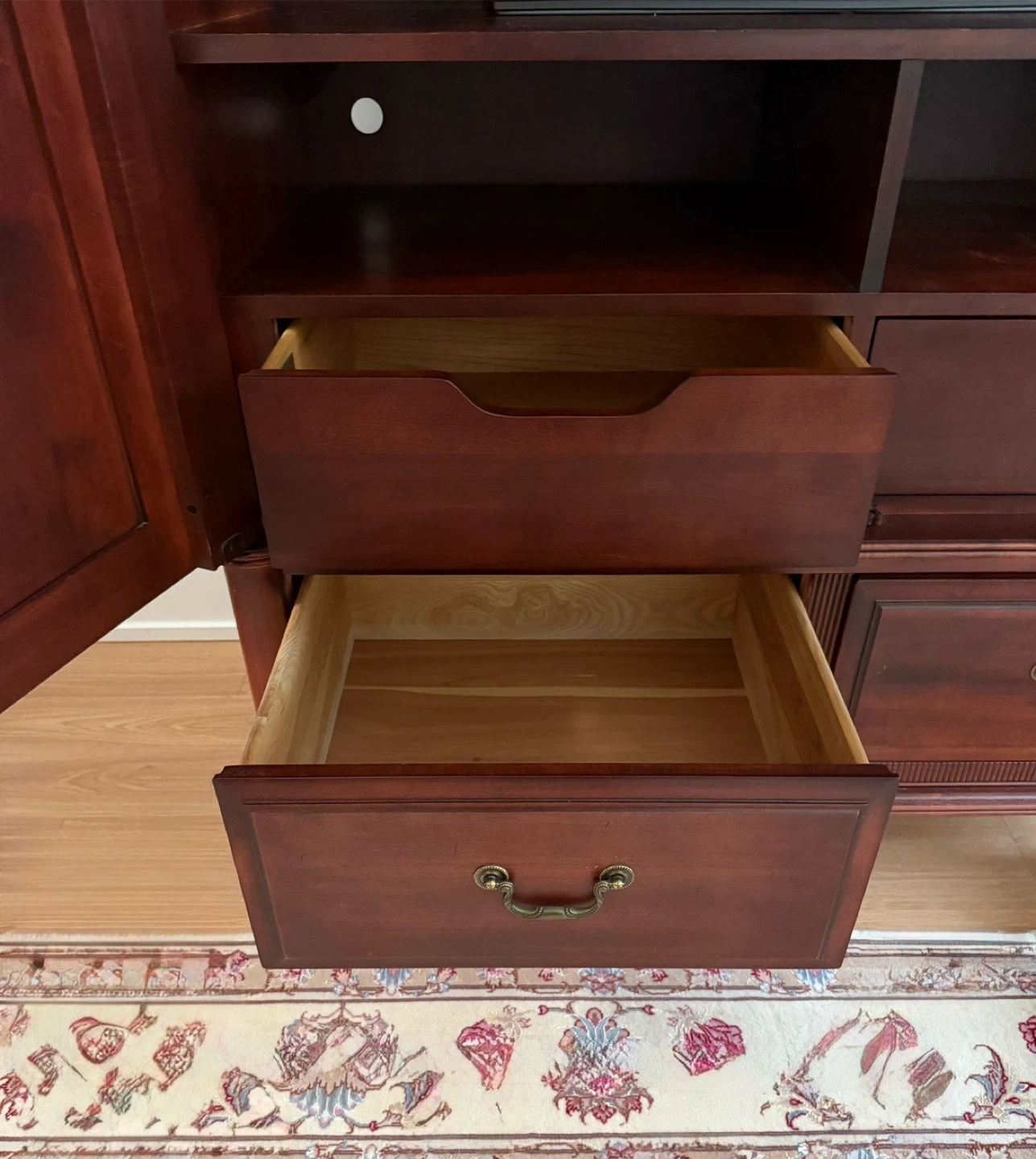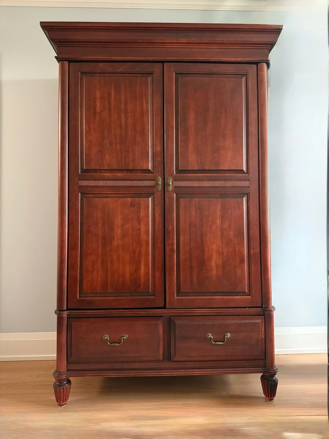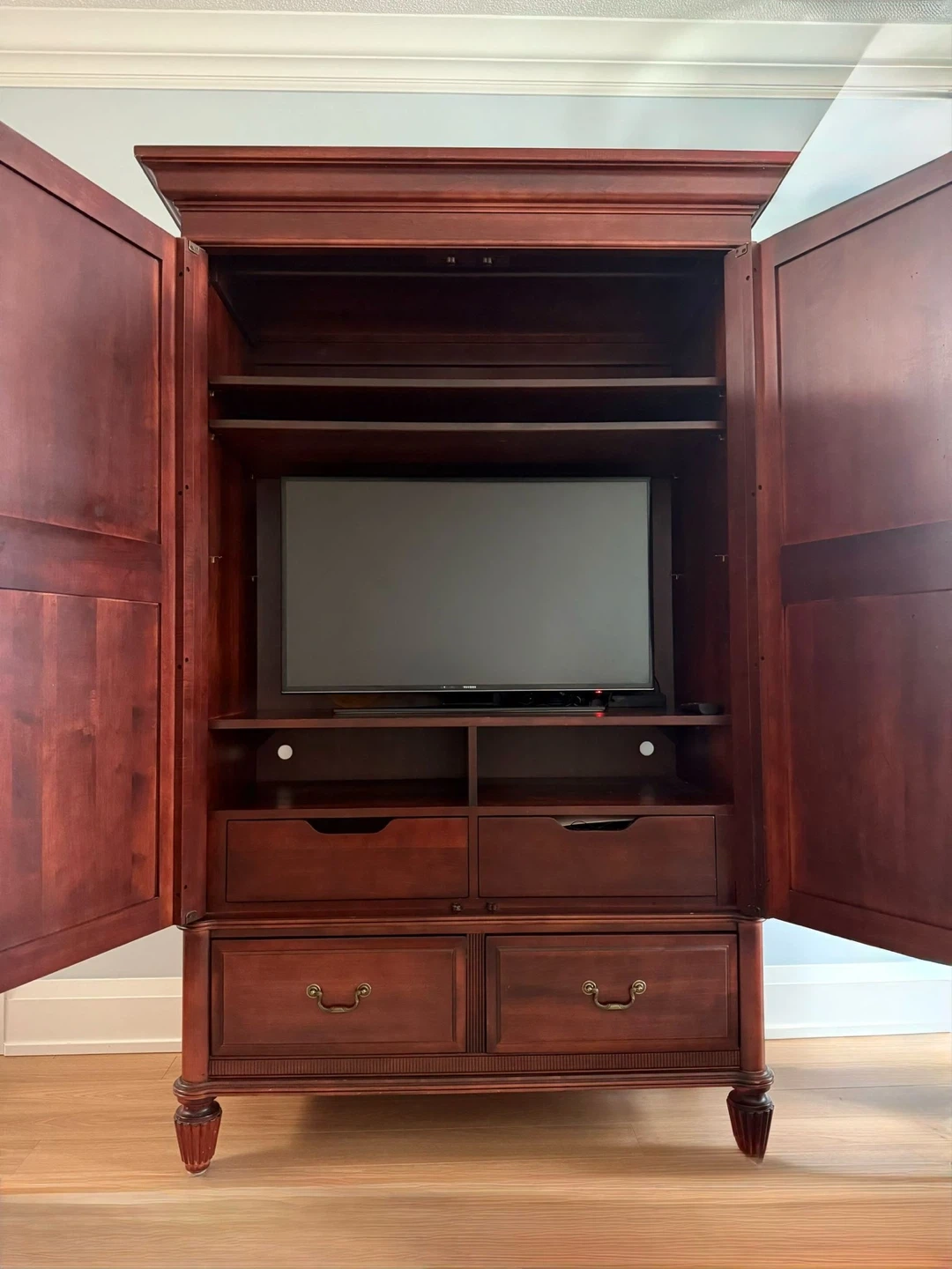 Selling a Durham Furniture solid wood armoire in good condition. It features drawers and shelves, perfect for storage. The armoire has a classic design and is made from quality solid wood.