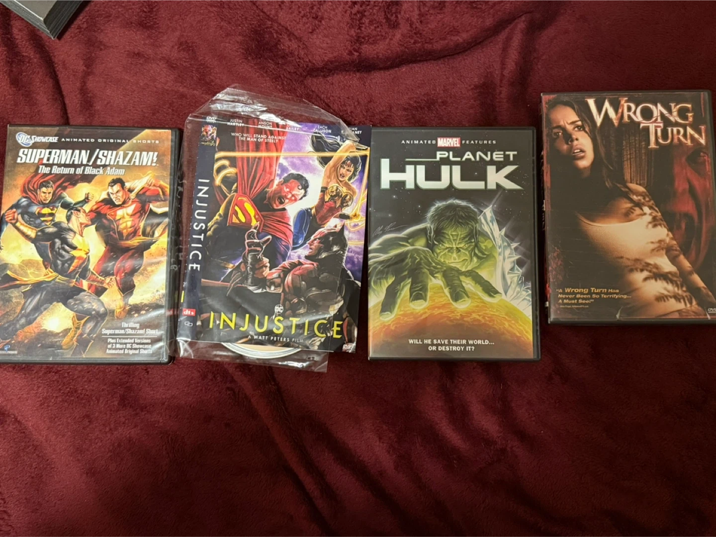 Selling a lot of four DVDs: - Wrong Turn - Hulk Planet Animated Marvel Features - Injustice - Superman/Shazam! The Return of Black Adam And much more!