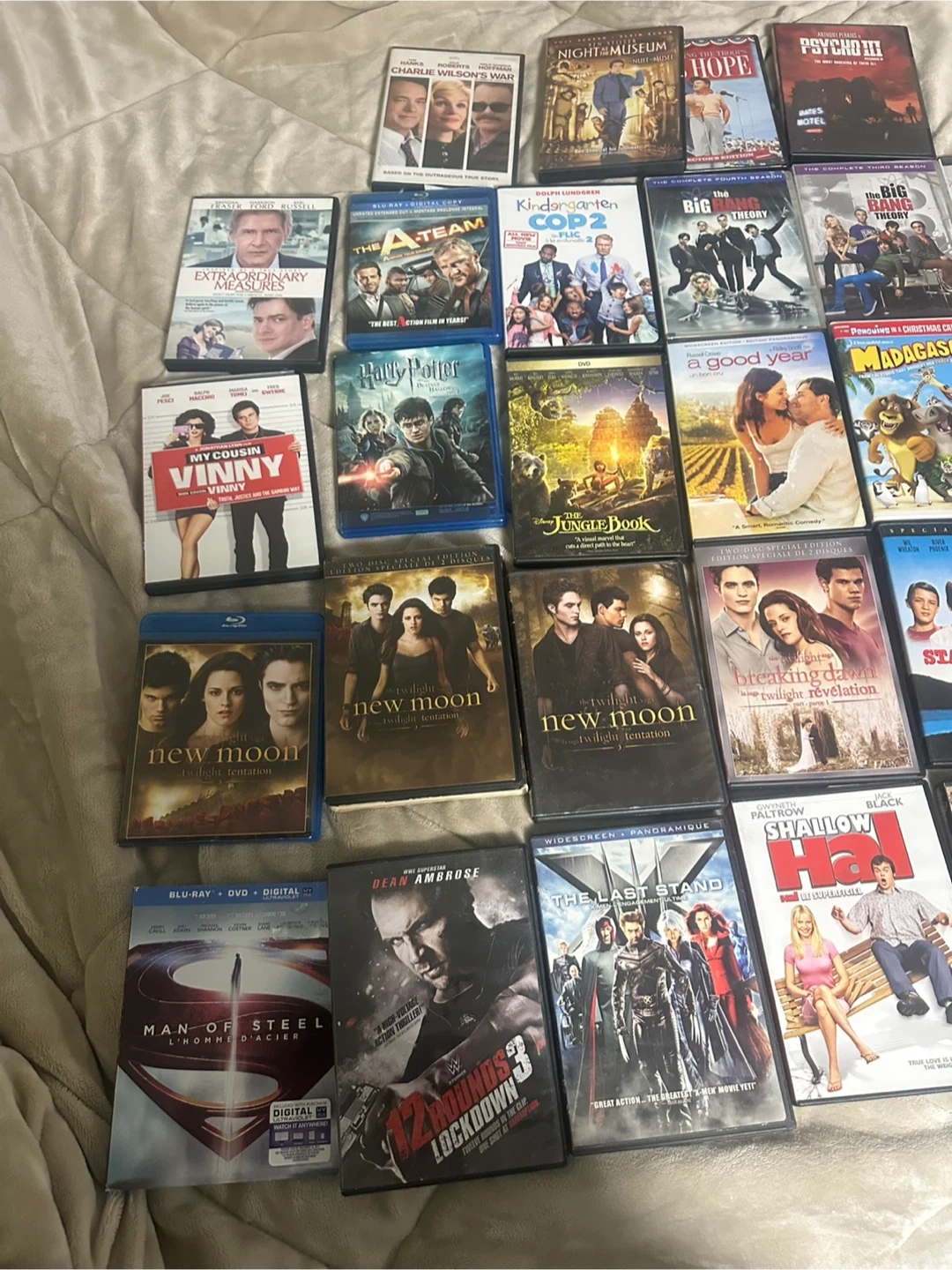 Selling a mixed collection of DVDs! Includes titles like Twilight, Harry Potter, Madagascar, and more. Great for family movie nights or expanding your collection