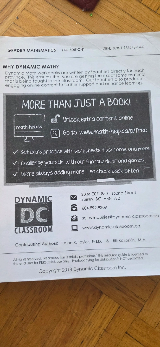 Selling a Grade 9 Mathematics workbook (BC Edition) by Dynamic Classroom. It includes extra online content to support learning, with worksheets, flashcards, and puzzles. Check out math-help.ca for more!