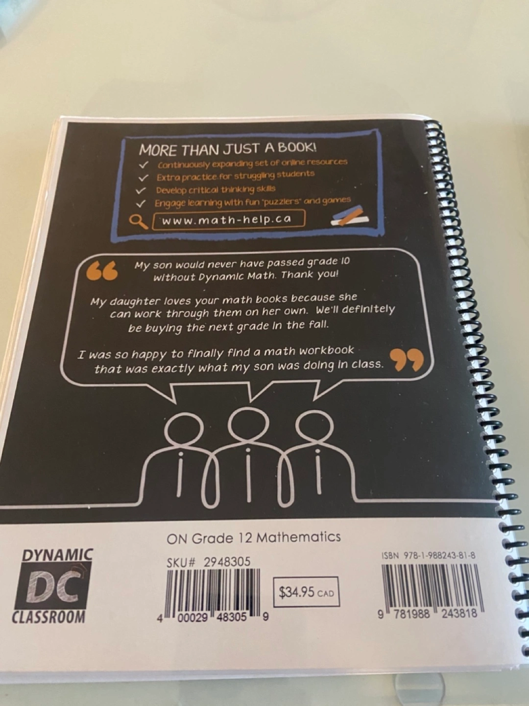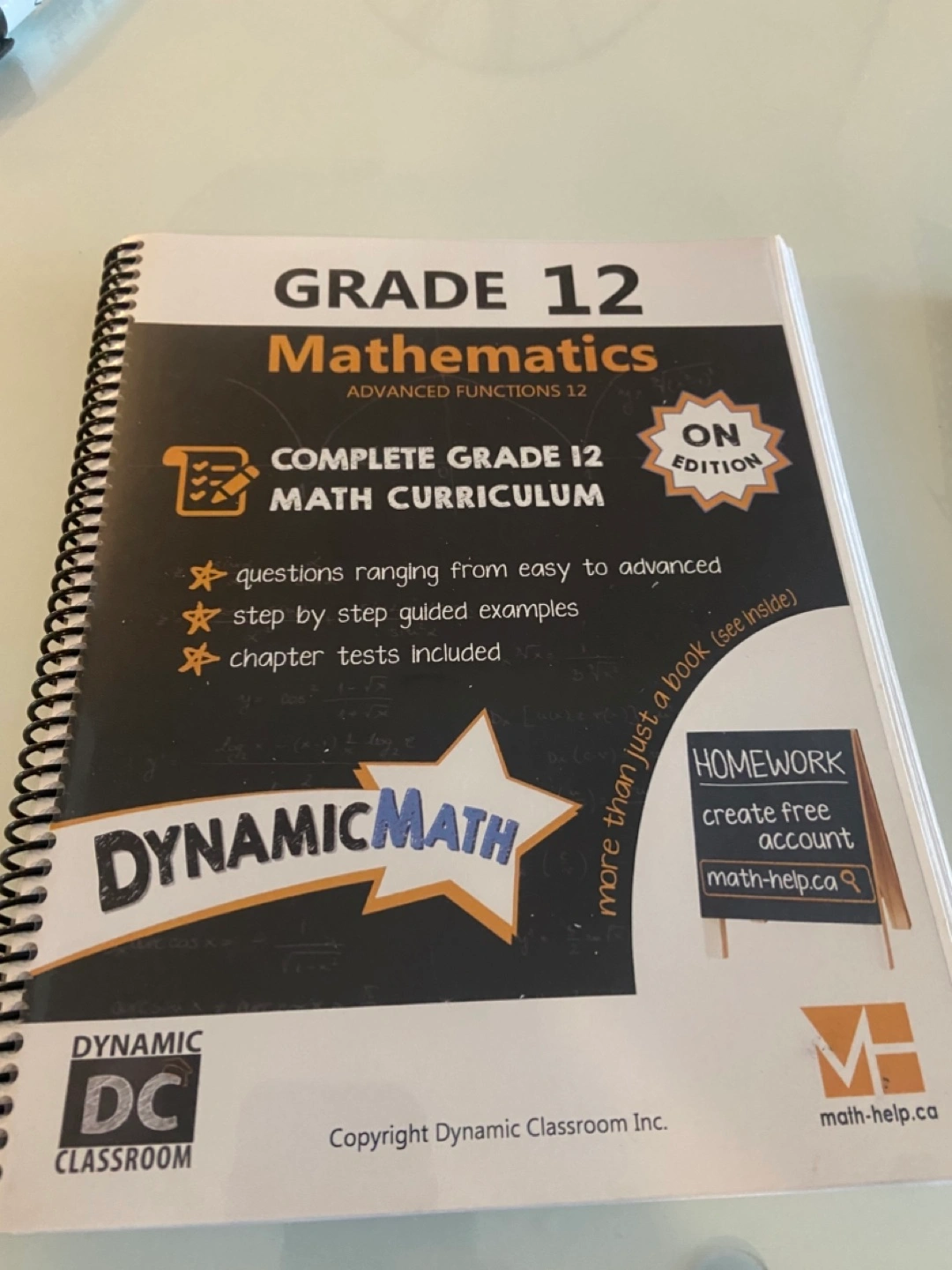 Selling a Dynamic Math Grade 12 textbook for Advanced Functions 12. This textbook covers the complete Grade 12 math curriculum, with questions ranging from easy to advanced and step-by-step guided examples. Chapter tests are included. Originally price $34.95 CAD. Available for pickup only near Distillery at Front Street and Rolling Mills Road (469 Front Street East)!