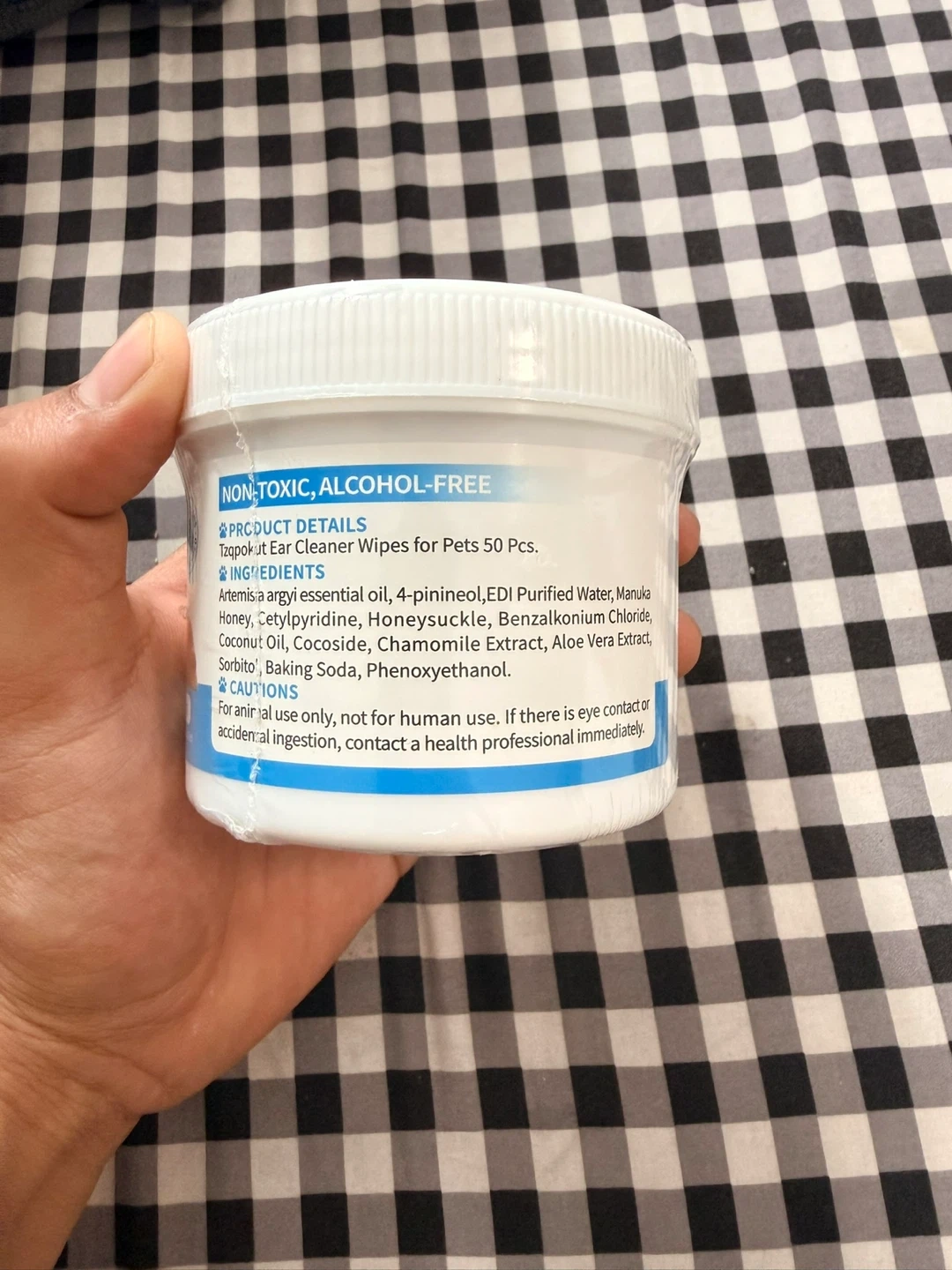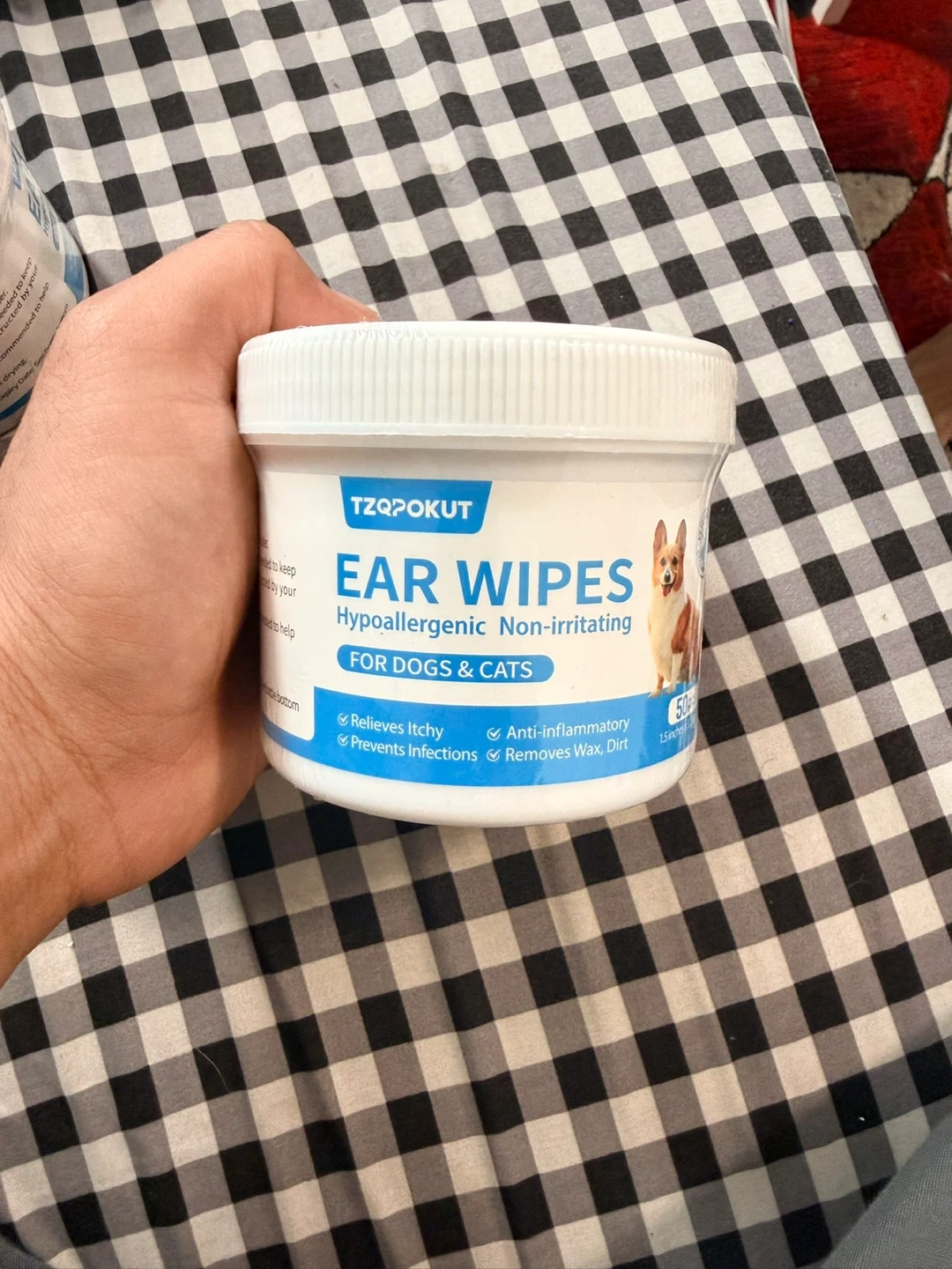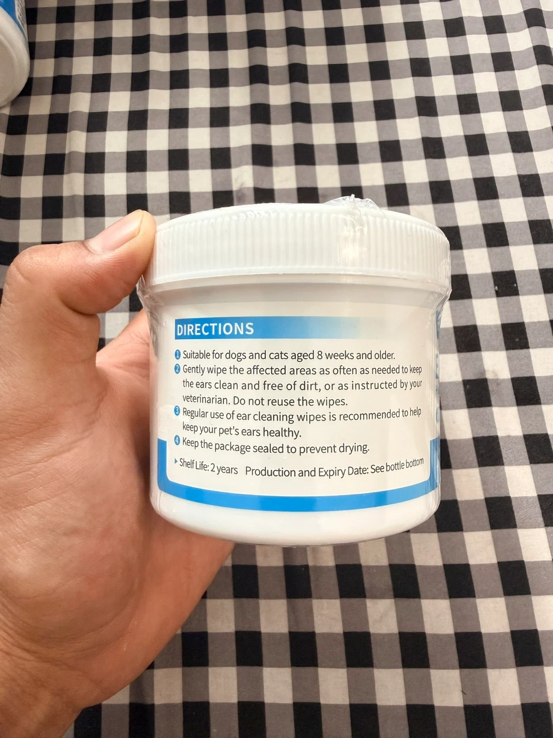 Selling a container of ear wipes for dogs and cats. These wipes are hypoallergenic and non-irritating, perfect for keeping your pet's ears clean. They help relieve itchiness, reduce inflammation, prevent infections, and remove wax and dirt. Expiry Date: July 08, 2026