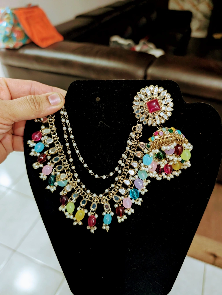 Selling a pair of earrings with a hair chain. The earrings feature colourful beads and intricate detailing. Perfect for adding a unique touch to your outfit!