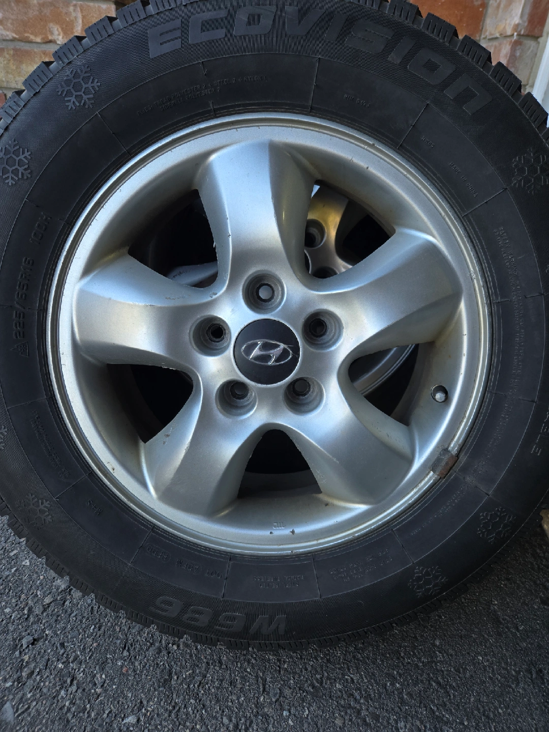 Complete set of 4 Ecovision W686 Winter Tires mounted and balanced on Hyundai Factory Rims. Tire Size: 225/65R16 Bolt Pattern: 5x114.3mm (5x4.5 inch) All 4 Tires are in great condition, still tons of tread life on the tires. 10/32mm to be exact (See pictures) Tires came off a 2018 Hyundai Tucson I sold the vehicle and just have the winter tires remaining, which i no longer have a use for. If I still had the vehicle, they would be going back on the vehicle for this upcoming winter season. These tires are already mounted and balanced on Hyundai Factory rims (16" rims) Tires are in pristine condition, never been punched, patched or repaired for any reason. 9/10 condition. Cash Only Pick up in Vaughan.