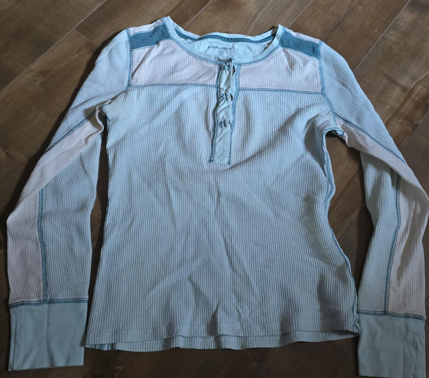 Cozy Eddie Bauer long sleeve top in size small! It's a light blue waffle knit with pink and darker blue accents. Perfect for layering or wearing on its own on a cool day