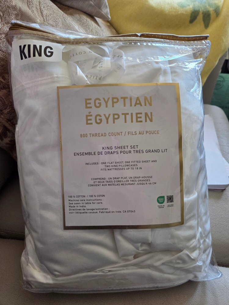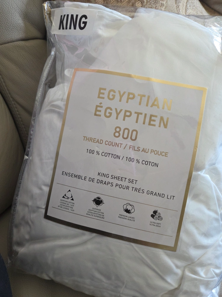 Selling a brand new Egyptian 800 thread count king sheet set! This set is made of 100% cotton and includes one flat sheet, one fitted sheet, and two pillowcases. It fits mattresses up to 18 inches. Get a luxurious night's sleep!