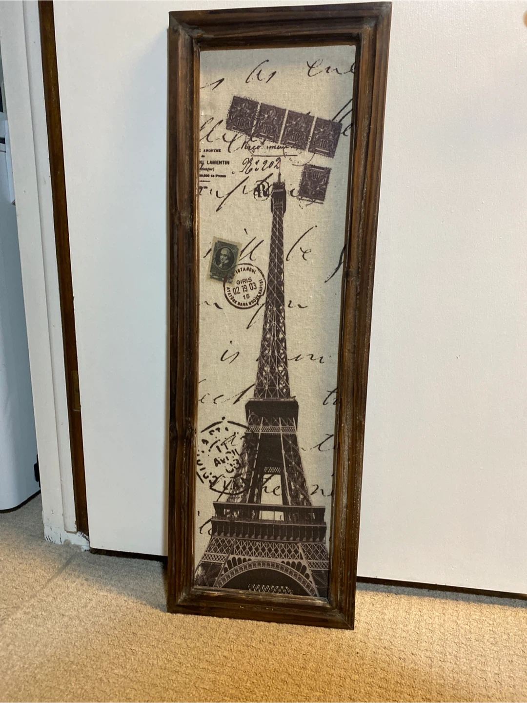 Add a touch of Parisian charm to your home with this framed print featuring the Eiffel Tower! The print has a vintage feel with old-style script and stamps, perfect for adding character to any room
