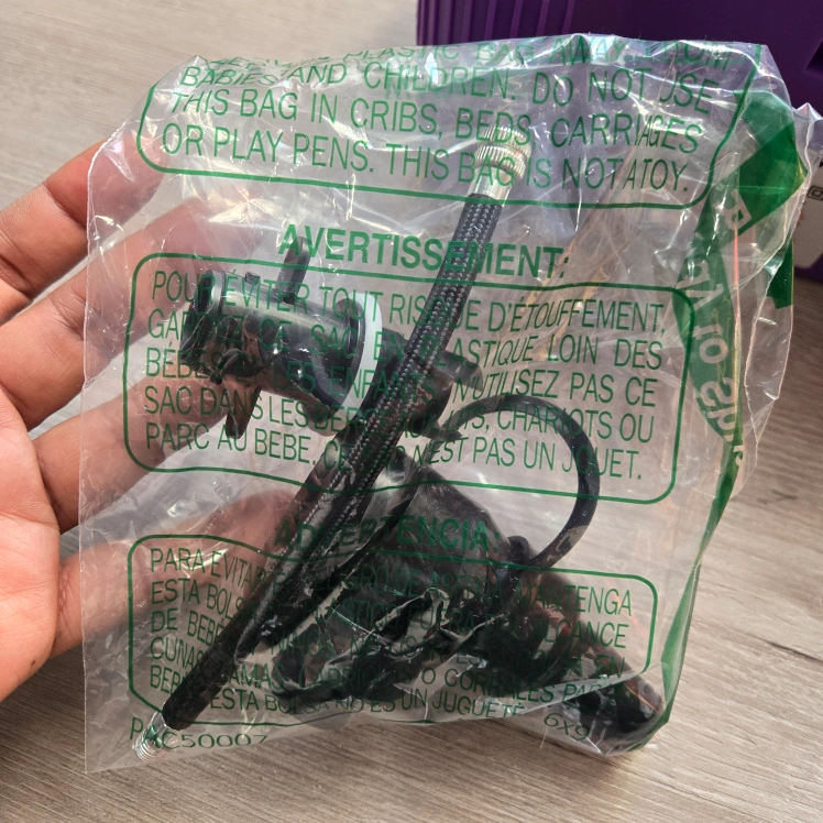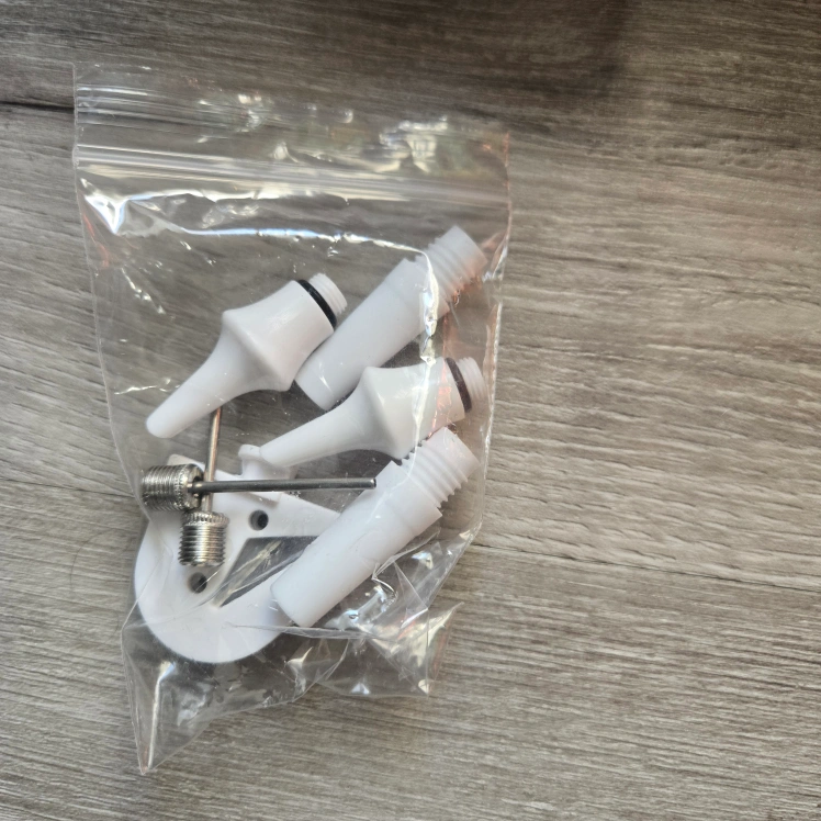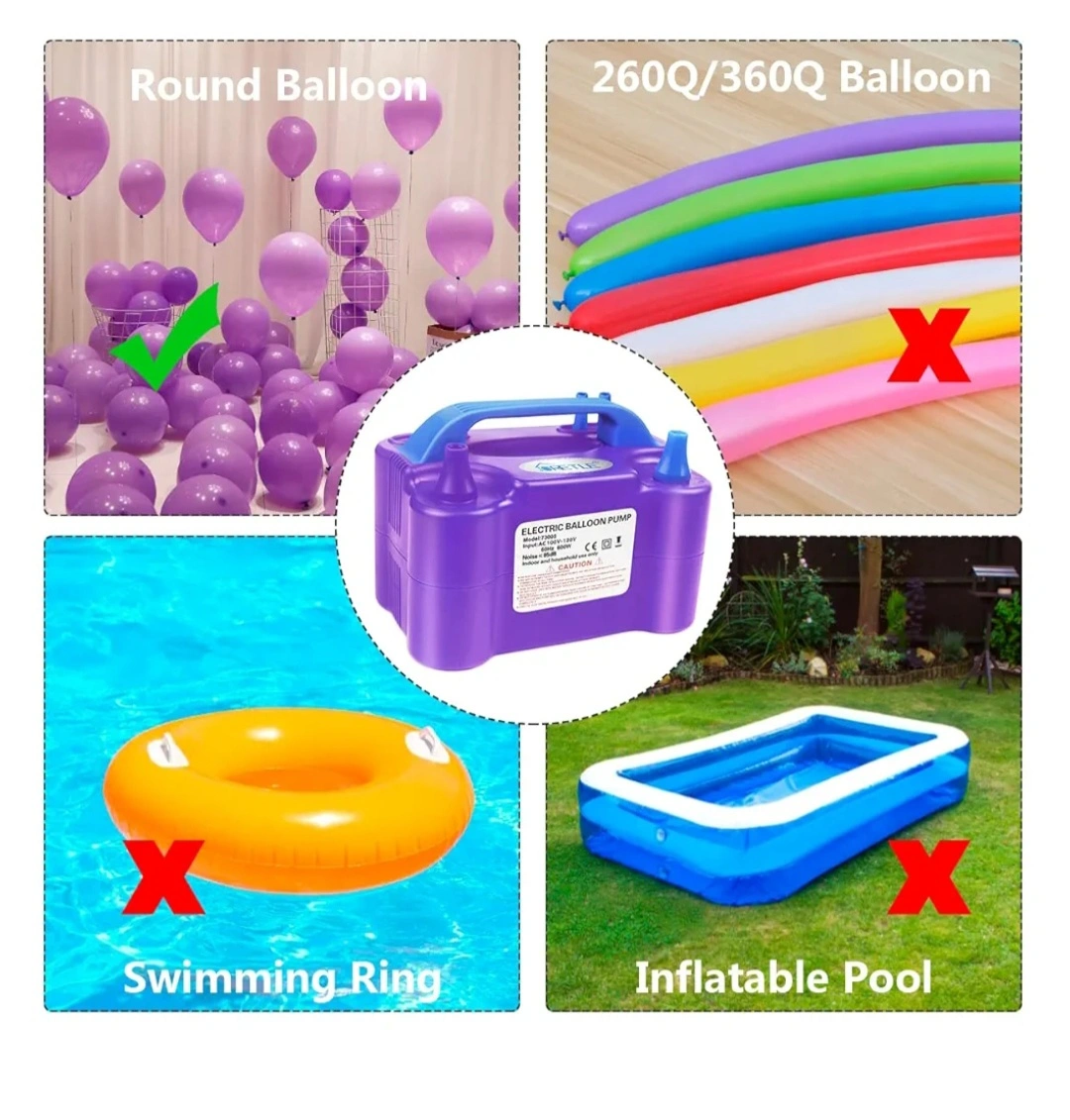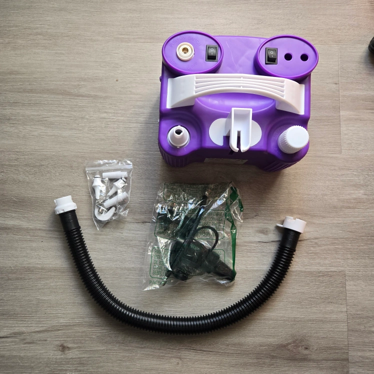 I'm selling an electric balloon pump by JORETLE. It's purple and white. This pump is great for inflating round balloons. It comes with some accessories.