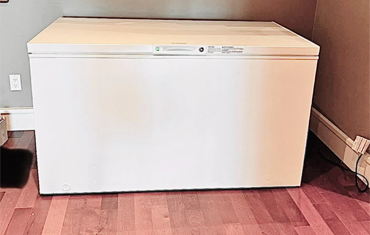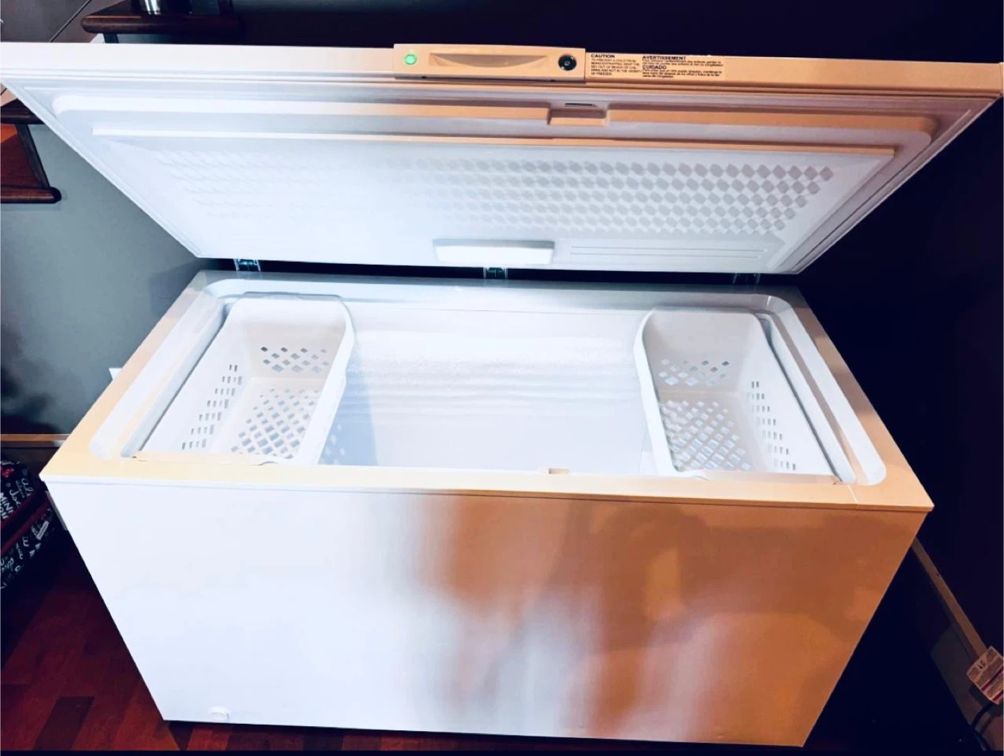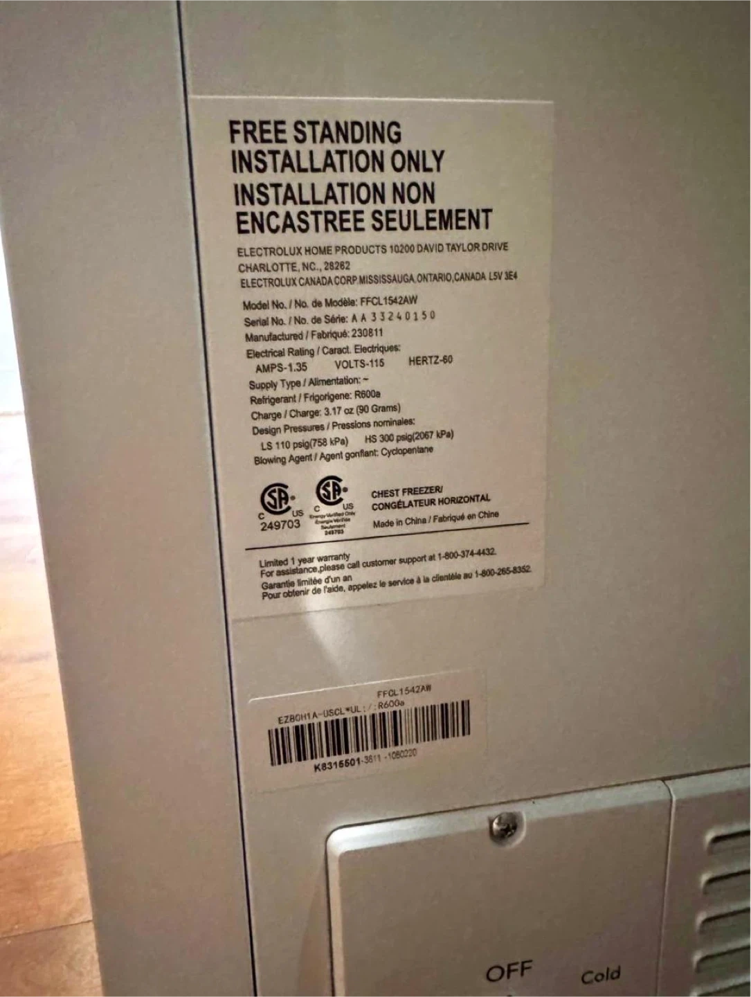 This is an Electrolux chest freezer, model FFCL1542AW. It's a freestanding unit that's perfect for extra storage. It comes with the baskets shown in the picture. Originally, it retailed for $892.00 I’m selling it for $590