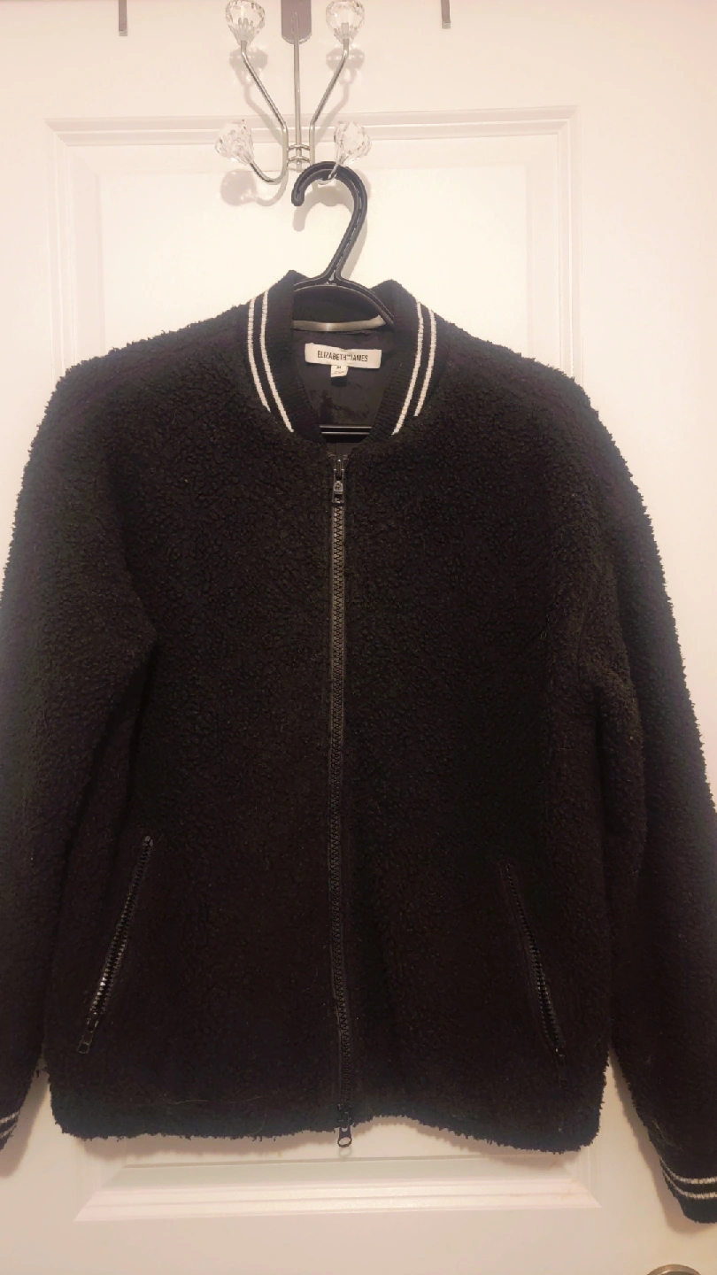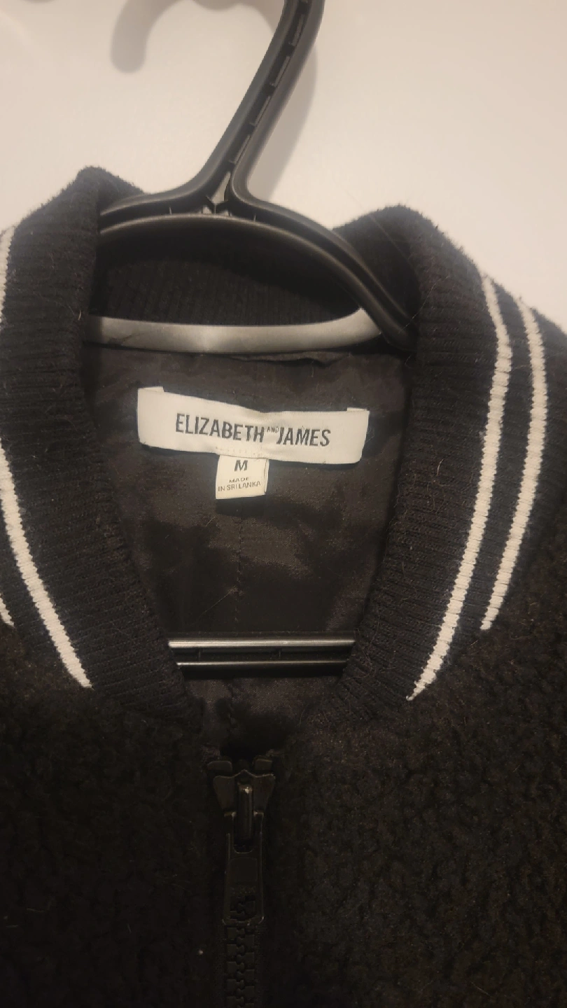 Selling a cozy black sherpa like bomber jacket from Elizabeth and James! It's a size medium and features a classic bomber style with striped detailing on the collar and cuffs. Perfect for adding a touch of style to any outfit!