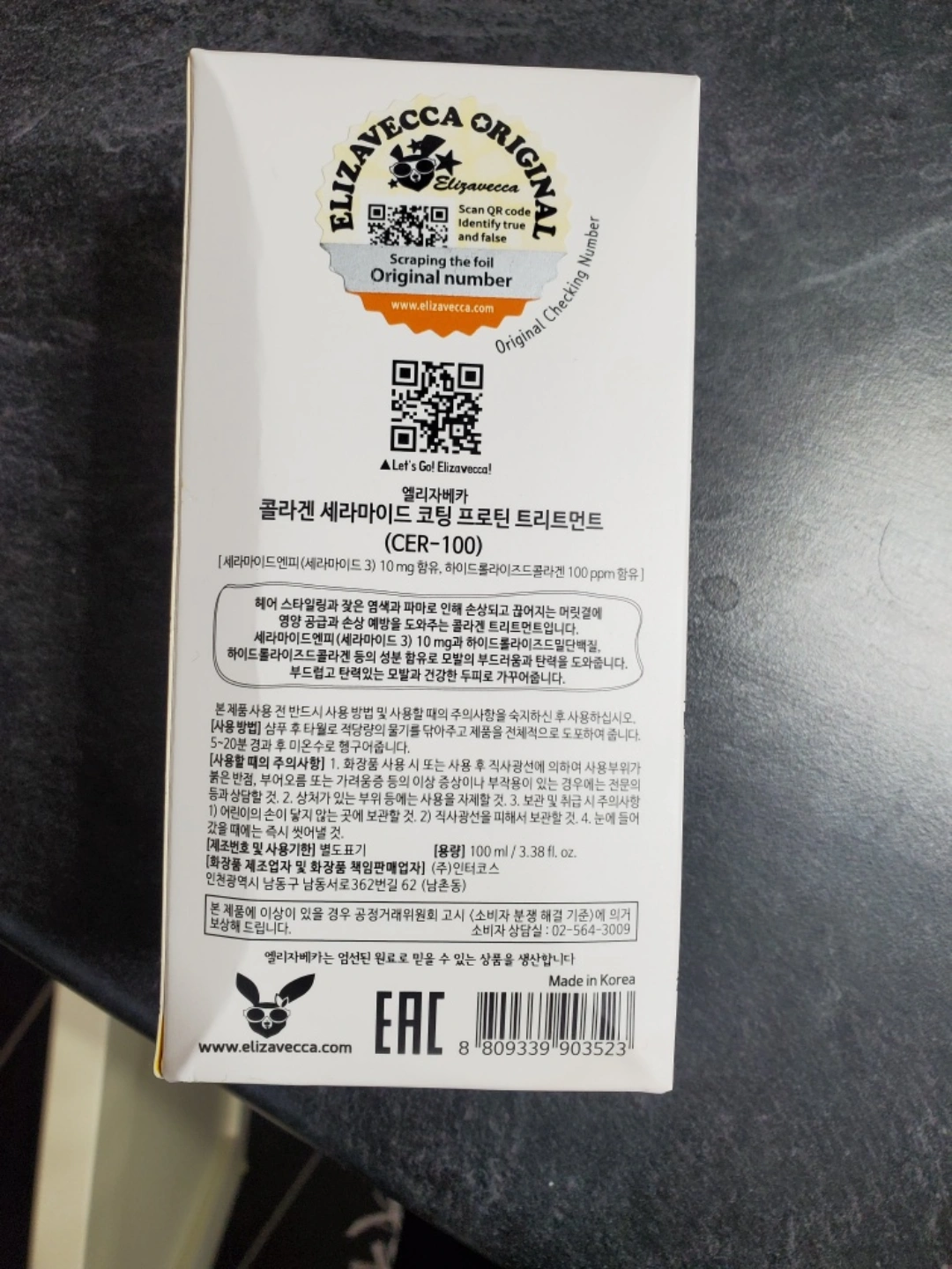 Selling k-beauty hair mask. Elizavecca CER-100 Collagen Ceramide Coating Protein Treatment. It's a hair treatment that comes in a 100ml / 3.38 fl oz size. The expiration date is 2026 November 14. Brand new, sealed.